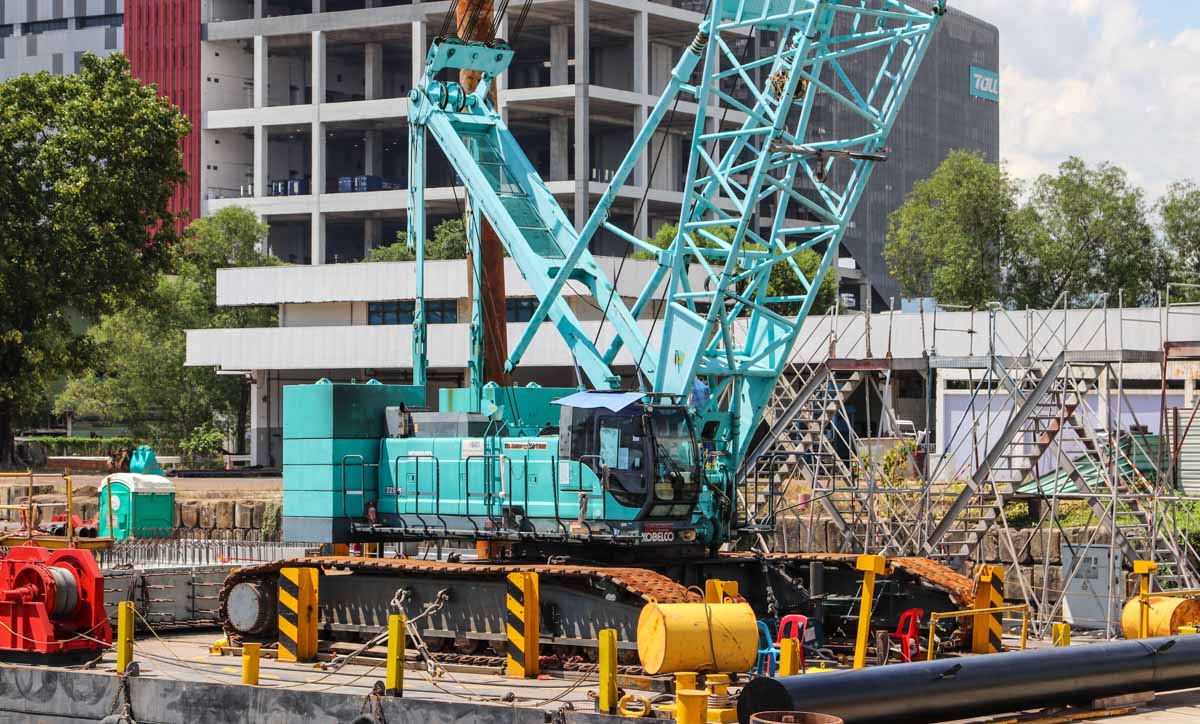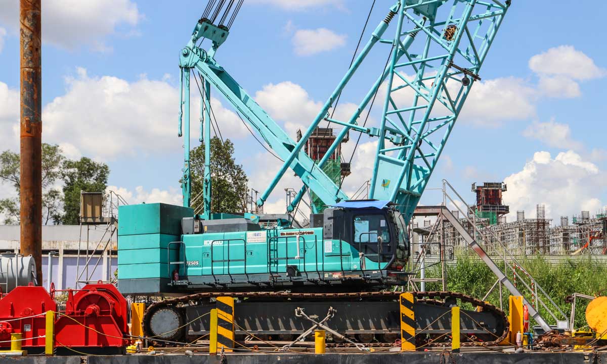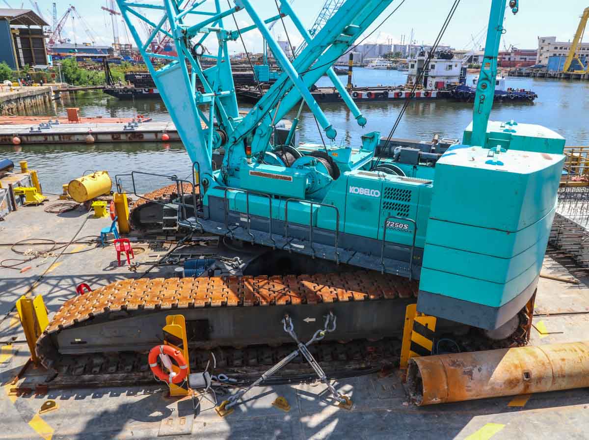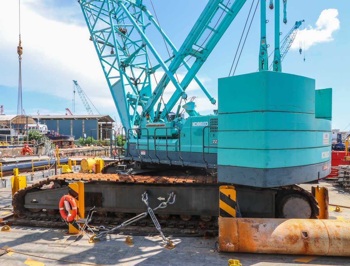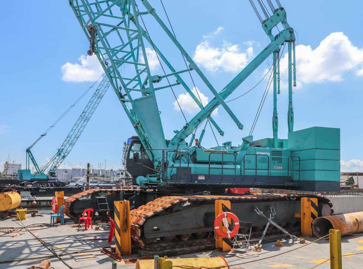 Dieser eindrucksvolle Kobelco 7250S gehört Marina Technology & Construction aus Singapur (SG) und wird hauptsächlich von einem Ponton aus für Arbeiten im Wasser und an Küsten eingesetzt. Es handelt sich um einen 250-Tonnen-Raupenkran aus dem Baujahr 2013.