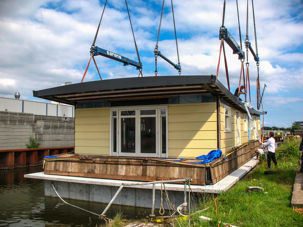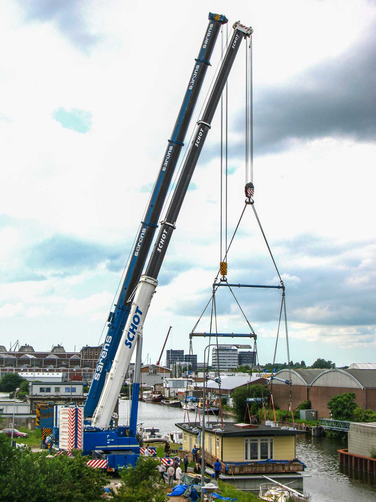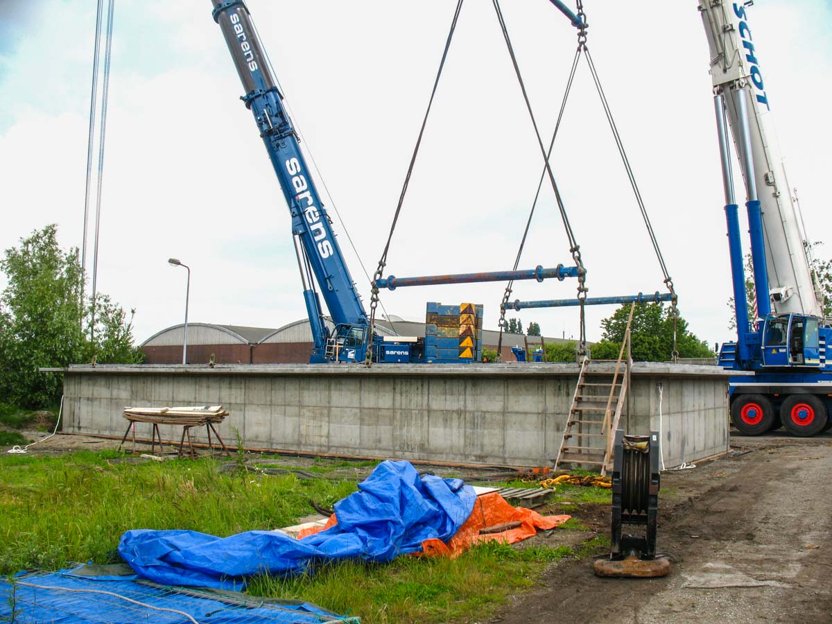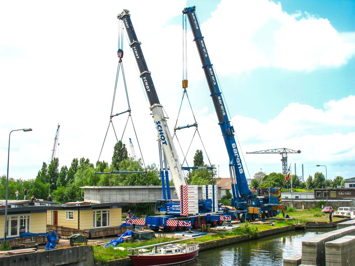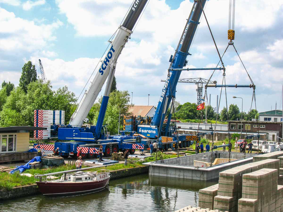 In Amsterdam (NL) musste eine neue Wohnark zu Wasser gelassen werden. Der große Betonkeller, der an Land errichtet worden war, wurde auf ein Gewicht von rund 175 Tonnen geschätzt. Um den Keller ins Wasser zu heben, wurde Schot aus Alkmaar (NL) beauftragt.