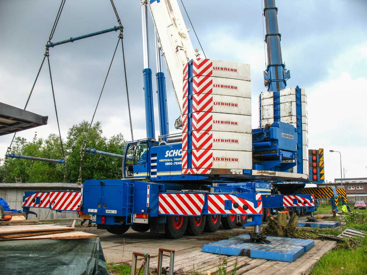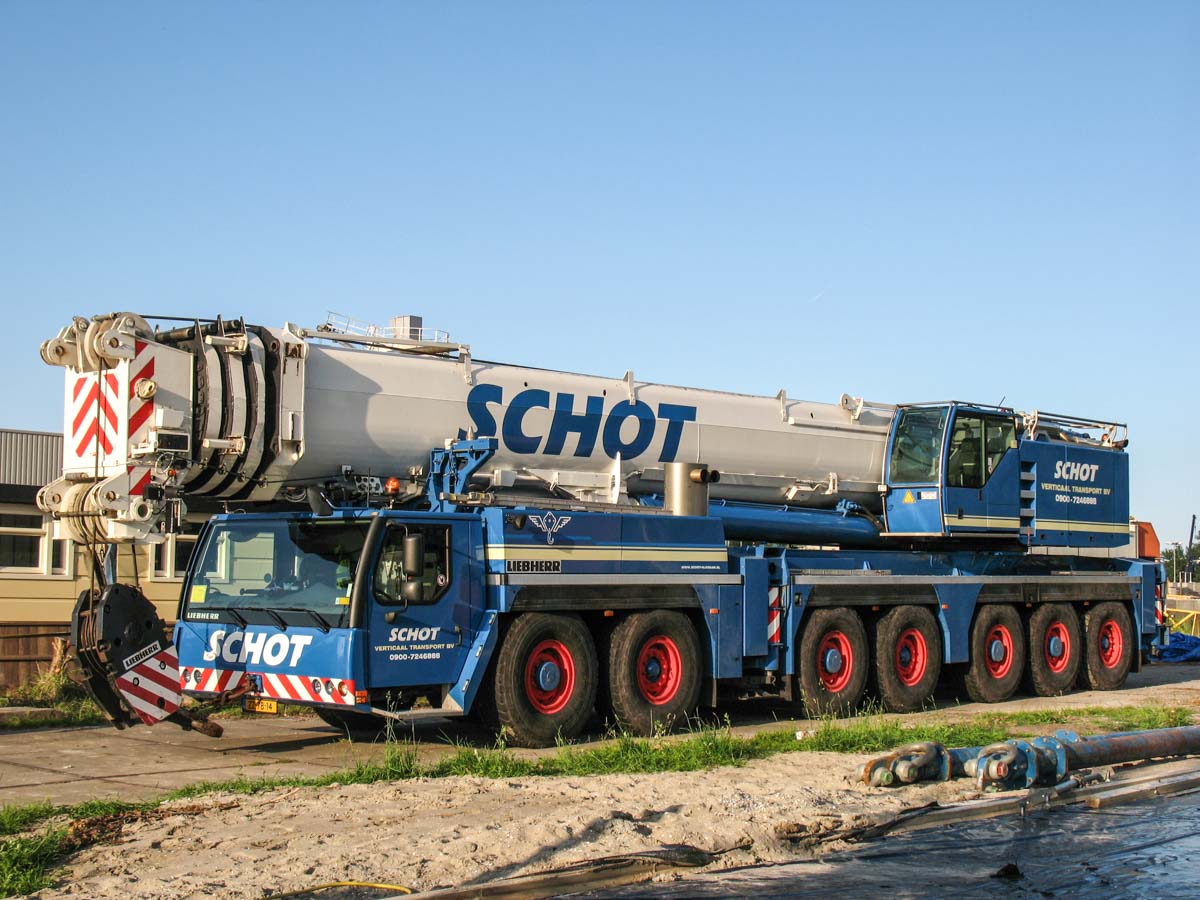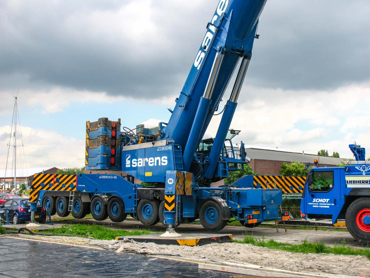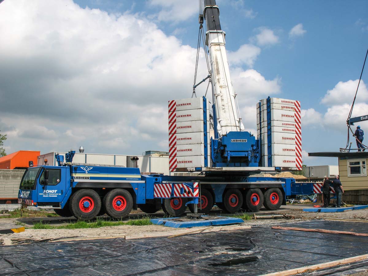 Schot setzte ihren (damals) größten Kran ein; den Liebherr LTM 1400-7.1. Hier aufgebaut mit der maximalen Ballastierung von 140 Tonnen.