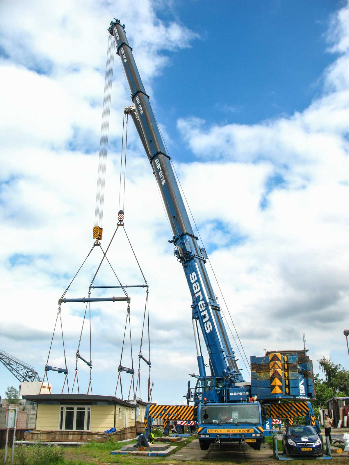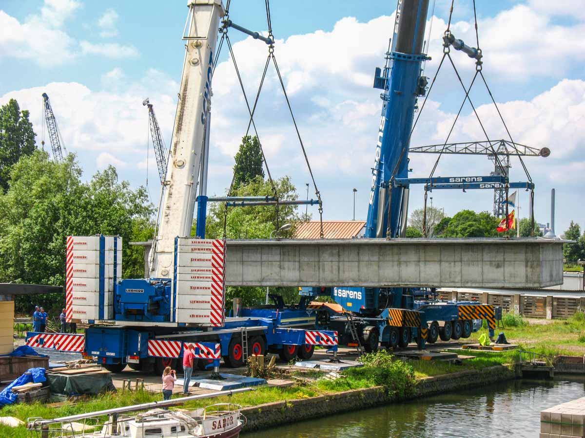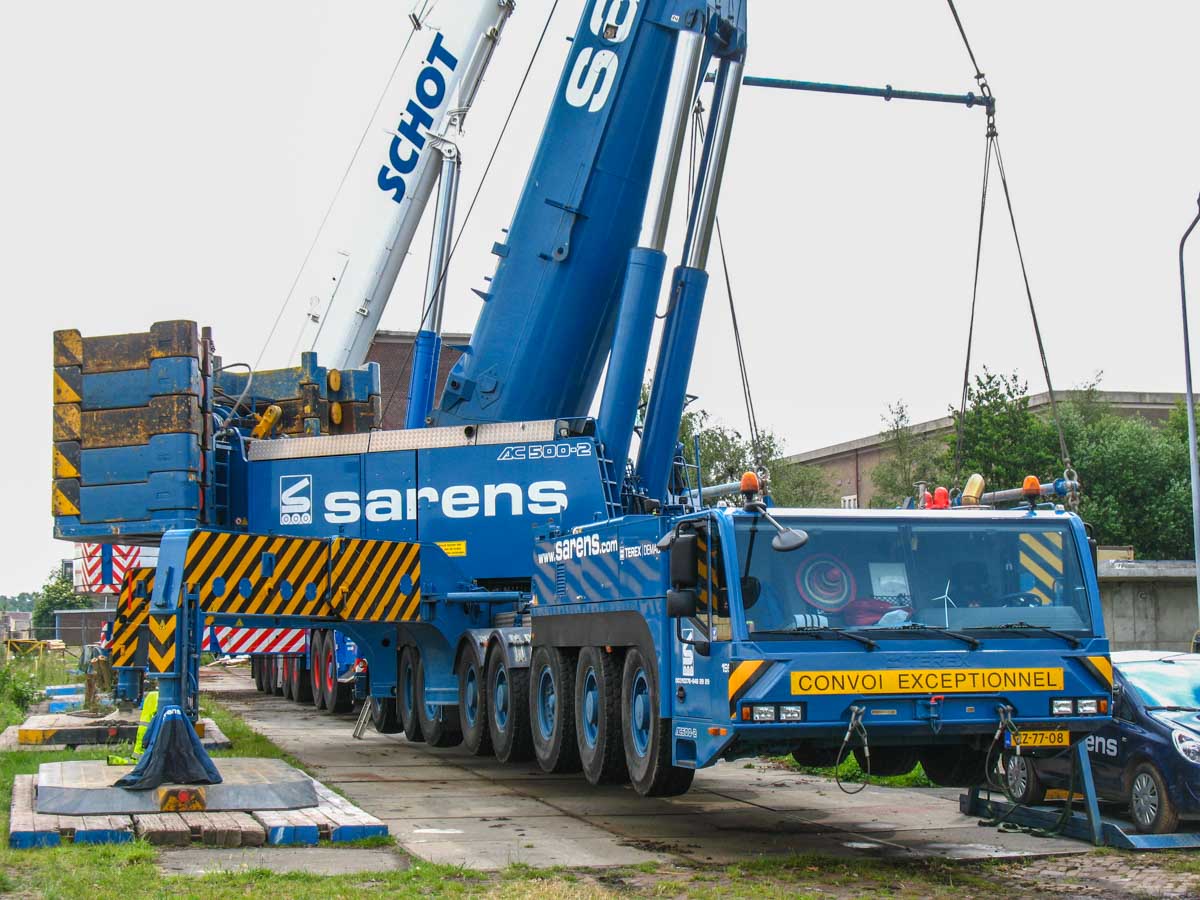 Bei Sarens wurde ein Terex AC 500-2 angemietet; dieser Kran wurde mit einer Ballastierung von 120 Tonnen aufgebaut.