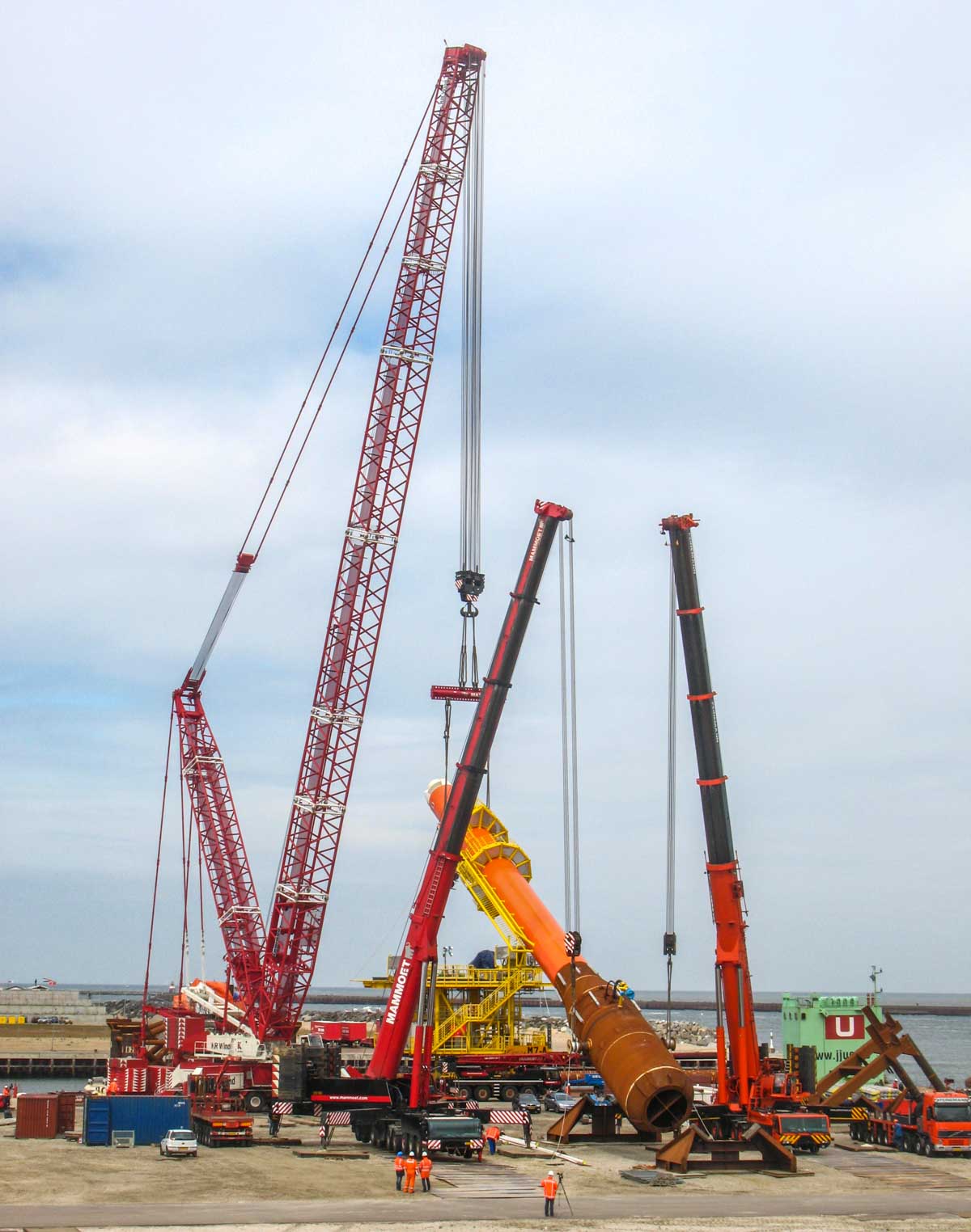 Dieser Monopile mit einem Gewicht von 265 Tonnen musste zunächst von einer horizontalen in eine vertikale Position gebracht werden. Zum Aufrichten des Monopiles wurden zwei Demag AC 650, von Mammoet und von Peinemann, eingesetzt.