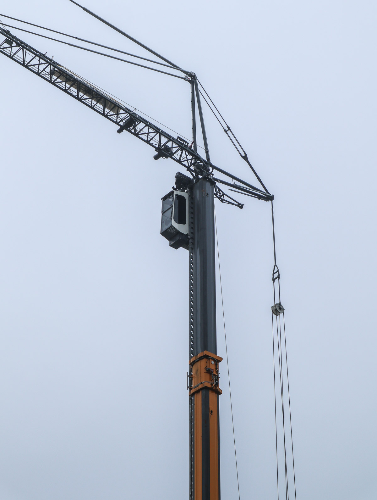 Im Laufkatzbetrieb hat der Ausleger eine maximale Länge von 58,5 Metern. Der Ausleger kann bei Bedarf auch in einem Winkel von 15, 30 oder 45 Grad gestellt werden. Im Wippmodus ist der Ausleger 60, 62,5 oder 65 Meter lang. Hier ist der Kran im Wippmodus mit einem 60 Meter langen Ausleger aufgebaut.