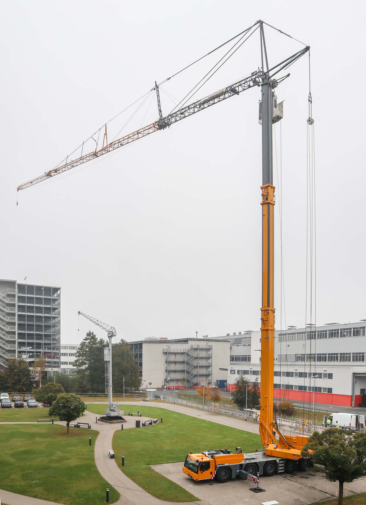 Hier war der Kran mit dem Grundballast von 4,3 Tonnen aufgebaut, dieser hat einen Drehkreis von 3,8 Metern. Der Ballast kann mit weiteren 9 Tonnen Ballast vergrößert werden, der Drehkreis beträgt dann 4,25 Meter.