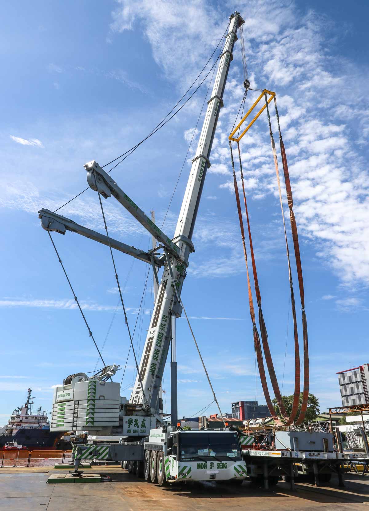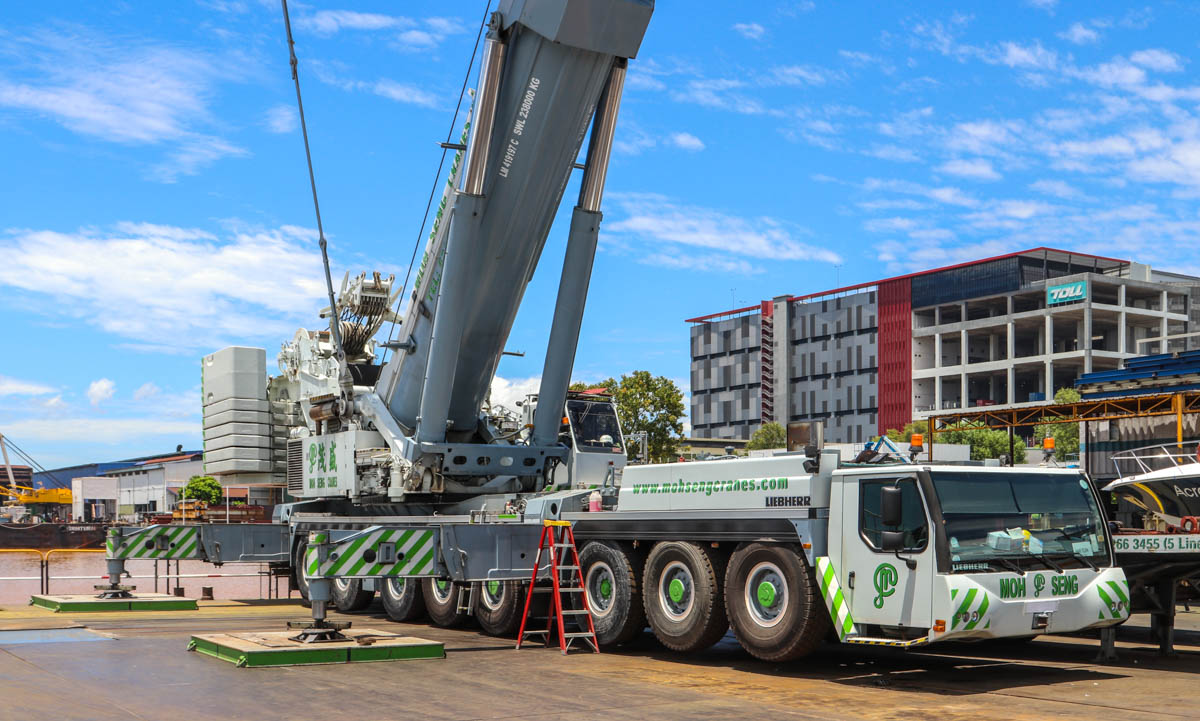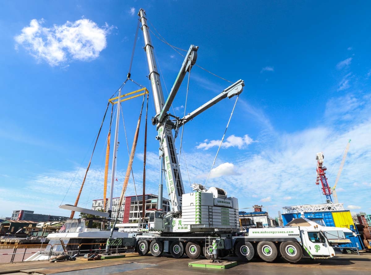 Hier sollte der beeindruckende Liebherr LTM 1500-8.1 von Moh Seng aus Singapur (SG) zum Heben eines Katamarans eingesetzt werden.