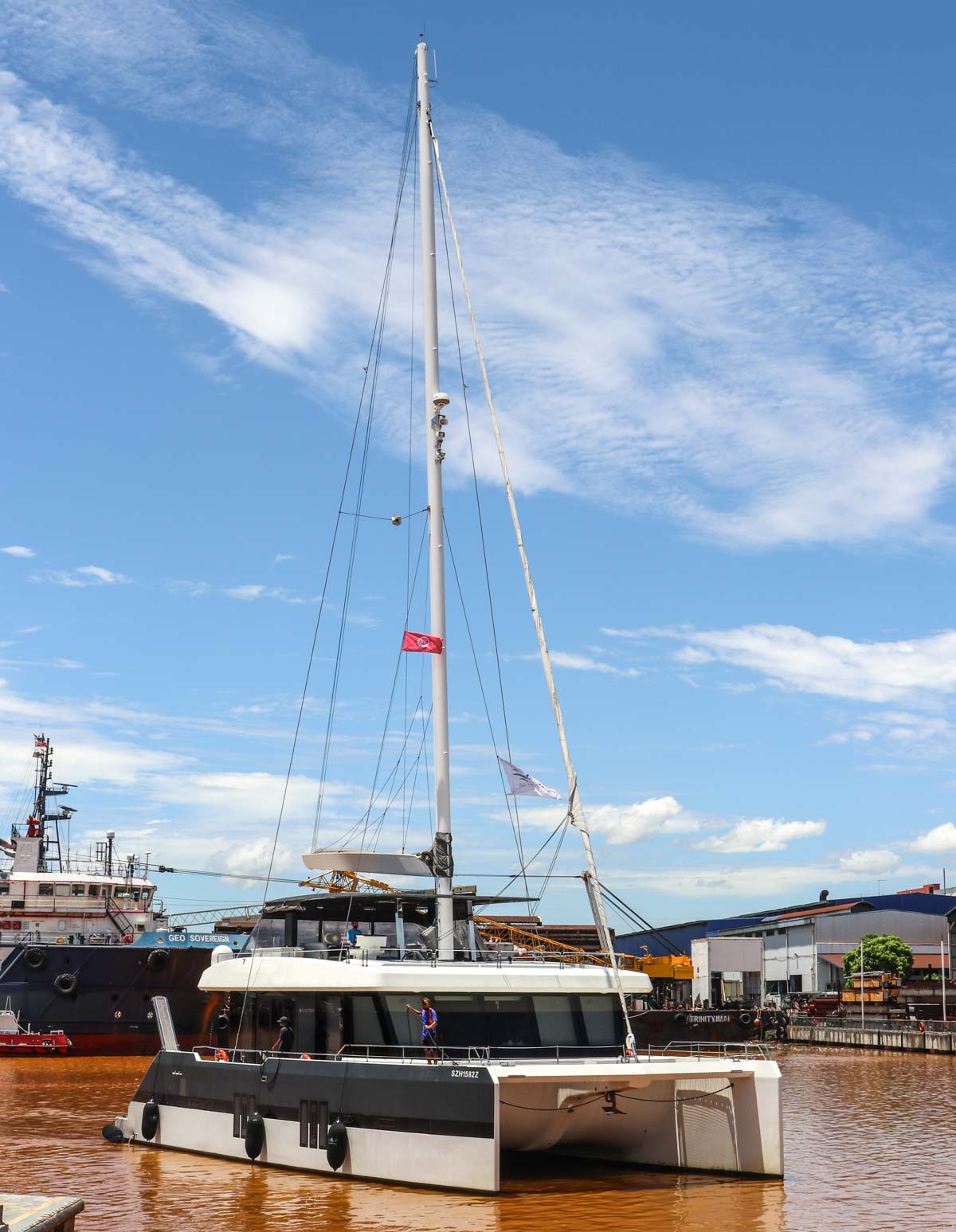 Hier kommt der Katamaran bereits angefahren. Der lange Segelmast wird beim Heben eine Herausforderung darstellen.