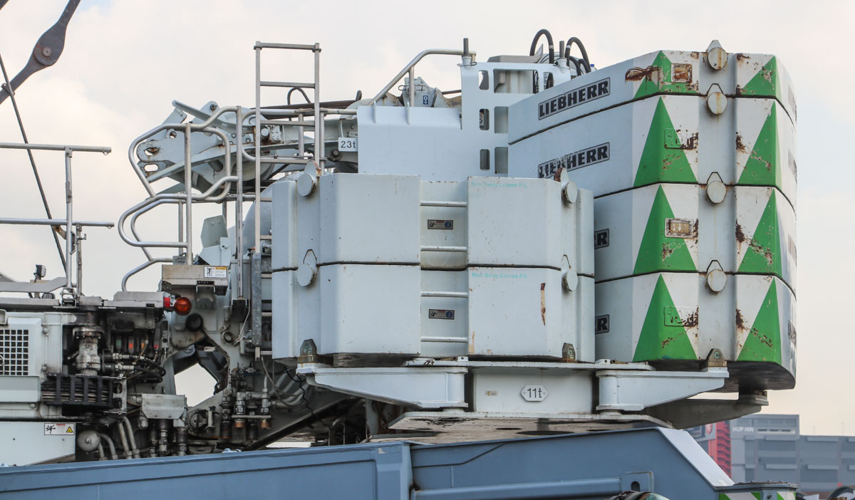 Hier war der Kran mit 144 Tonnen Ballast aufgebaut, was in dieser Konfiguration einen Schwenkradius von 8,33 Metern ergibt. Der volle Ballast dieses Krans beträgt 204 Tonnen.