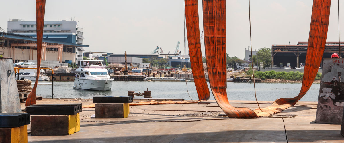 Die Anschlagmittel sind vorbereitet und im Hintergrund trifft die Yacht ein. Es handelt sich um eine Horizon E73 mit einer Länge von 73 ft (22,25 Metern).