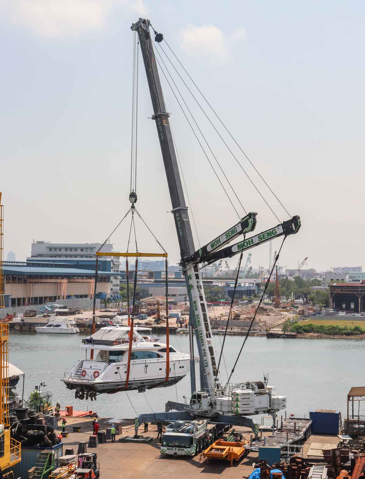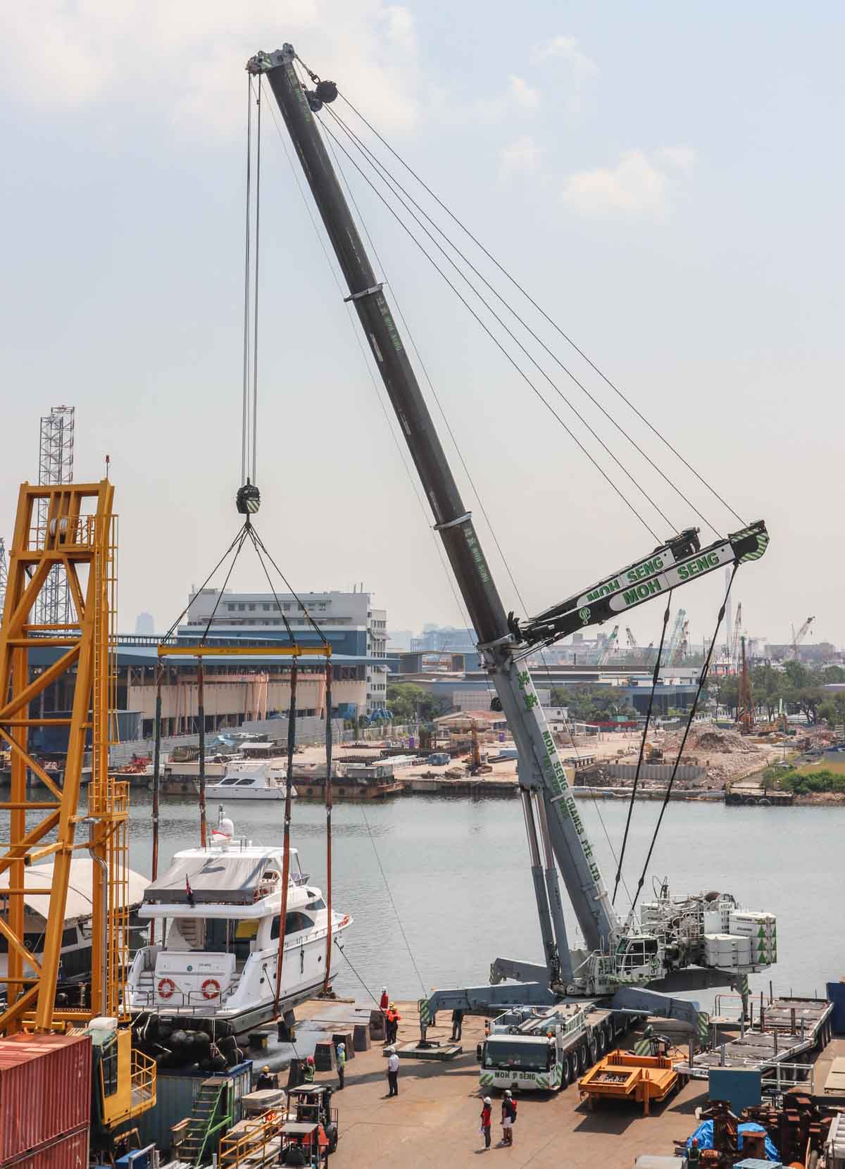 Der beeindruckende Liebherr LTM 1750-9.1 von Moh Seng aus Singapur (SG) steht hier bereit, um eine Yacht aus dem Wasser zu heben.
