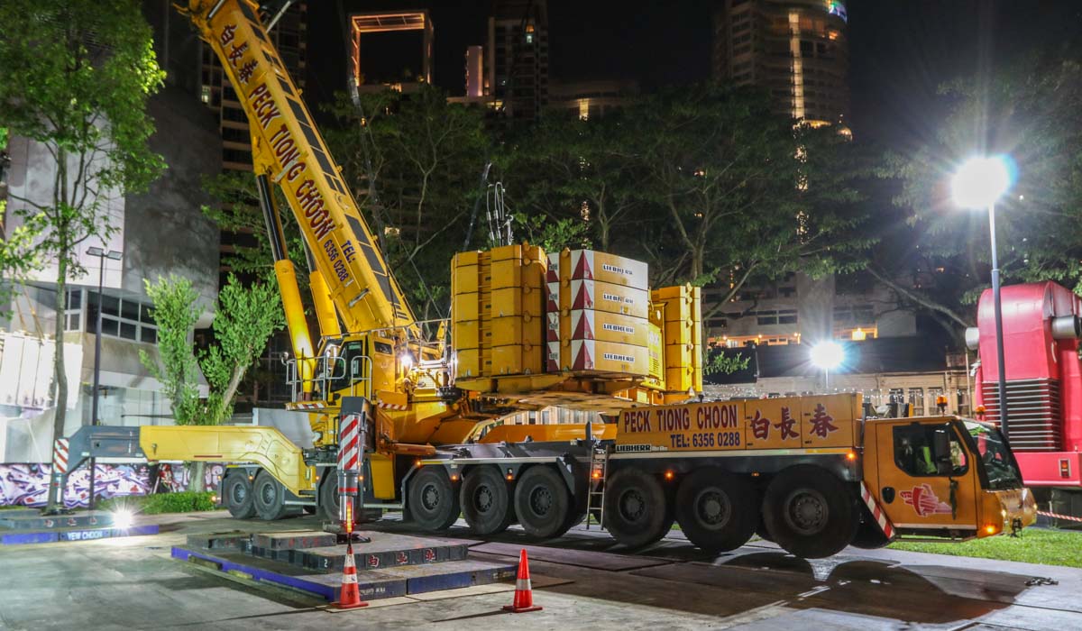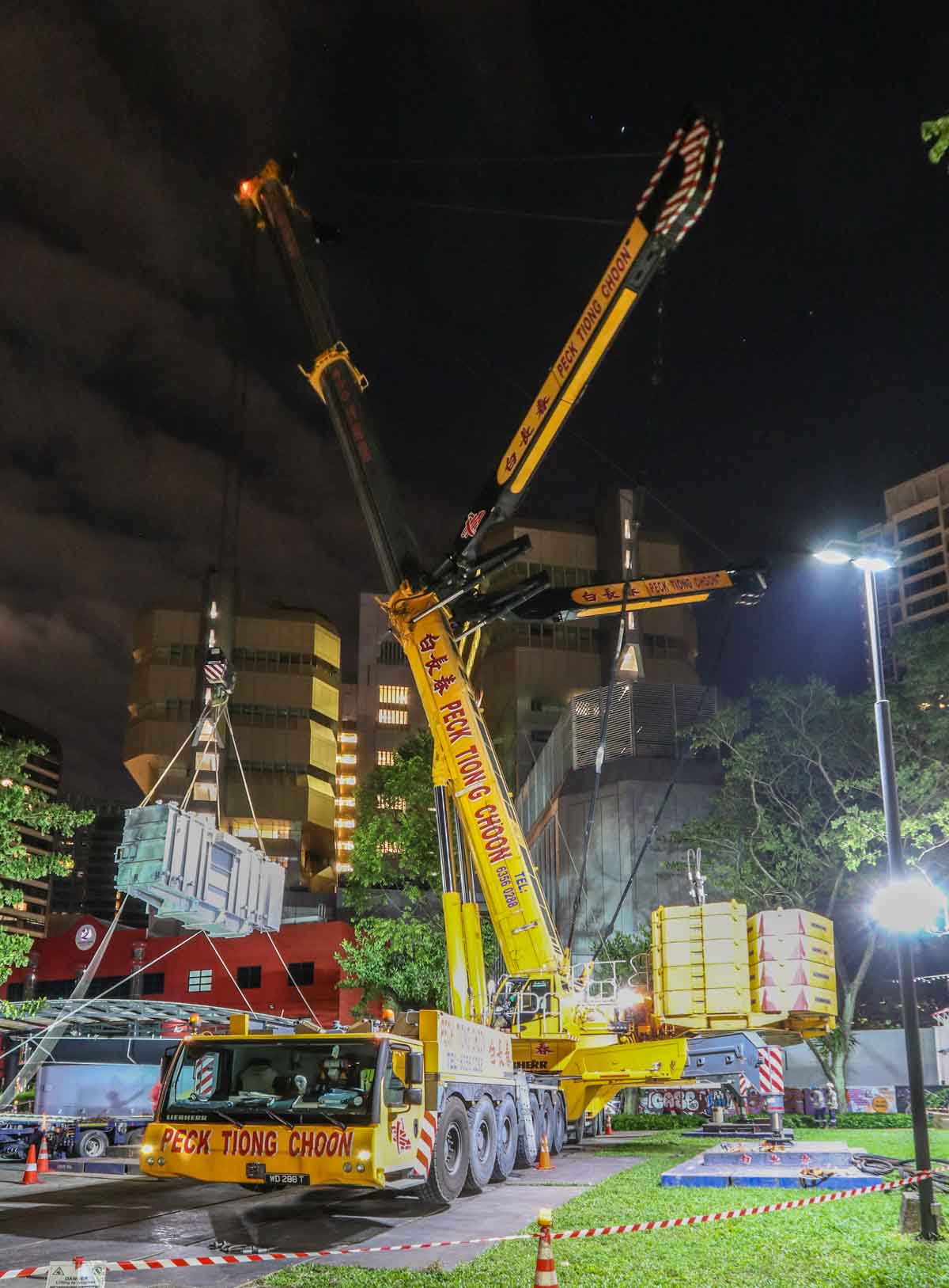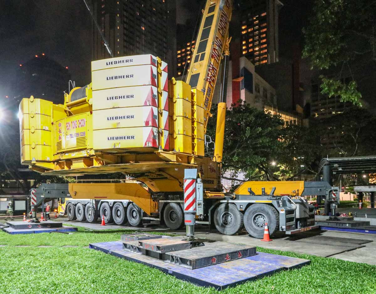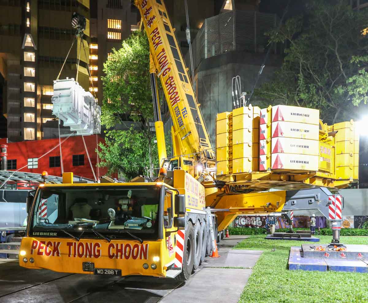 Der attraktive Liebherr LTM 1750-9.1 von Peck Tiong Choon aus Singapur (SG) wurde in den Nachtstunden eingesetzt, um zwei Transformatoren im Stadtzentrum auszutauschen. Einige Wochen zuvor wurde am gleichen Ort bereits der LTM 1750-9.1 von Moh Seng eingesetzt.