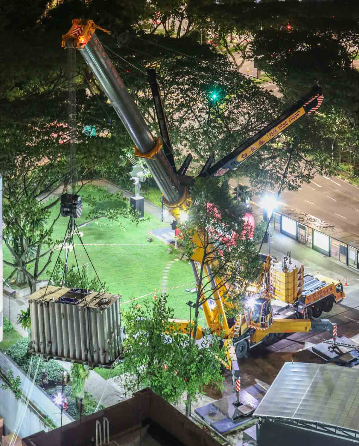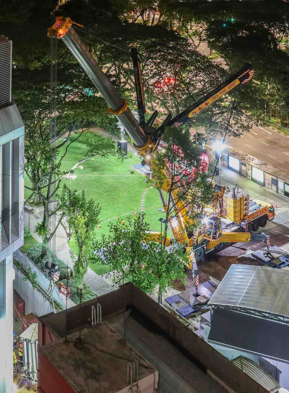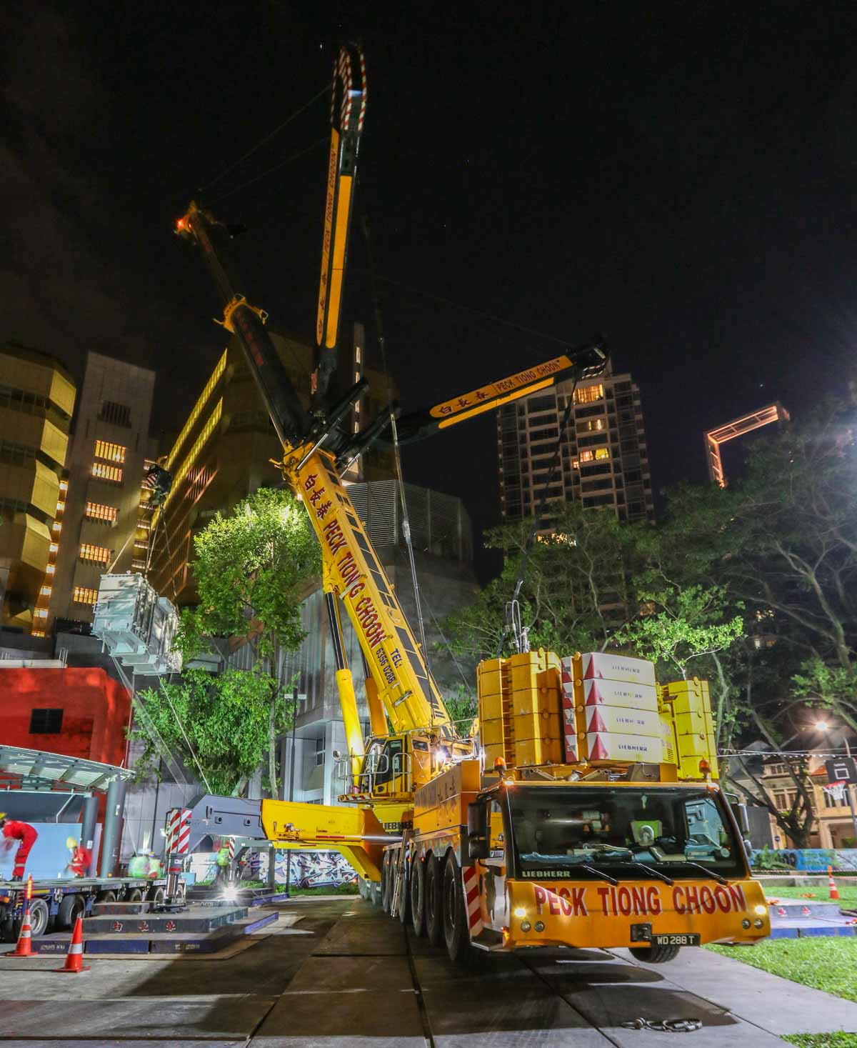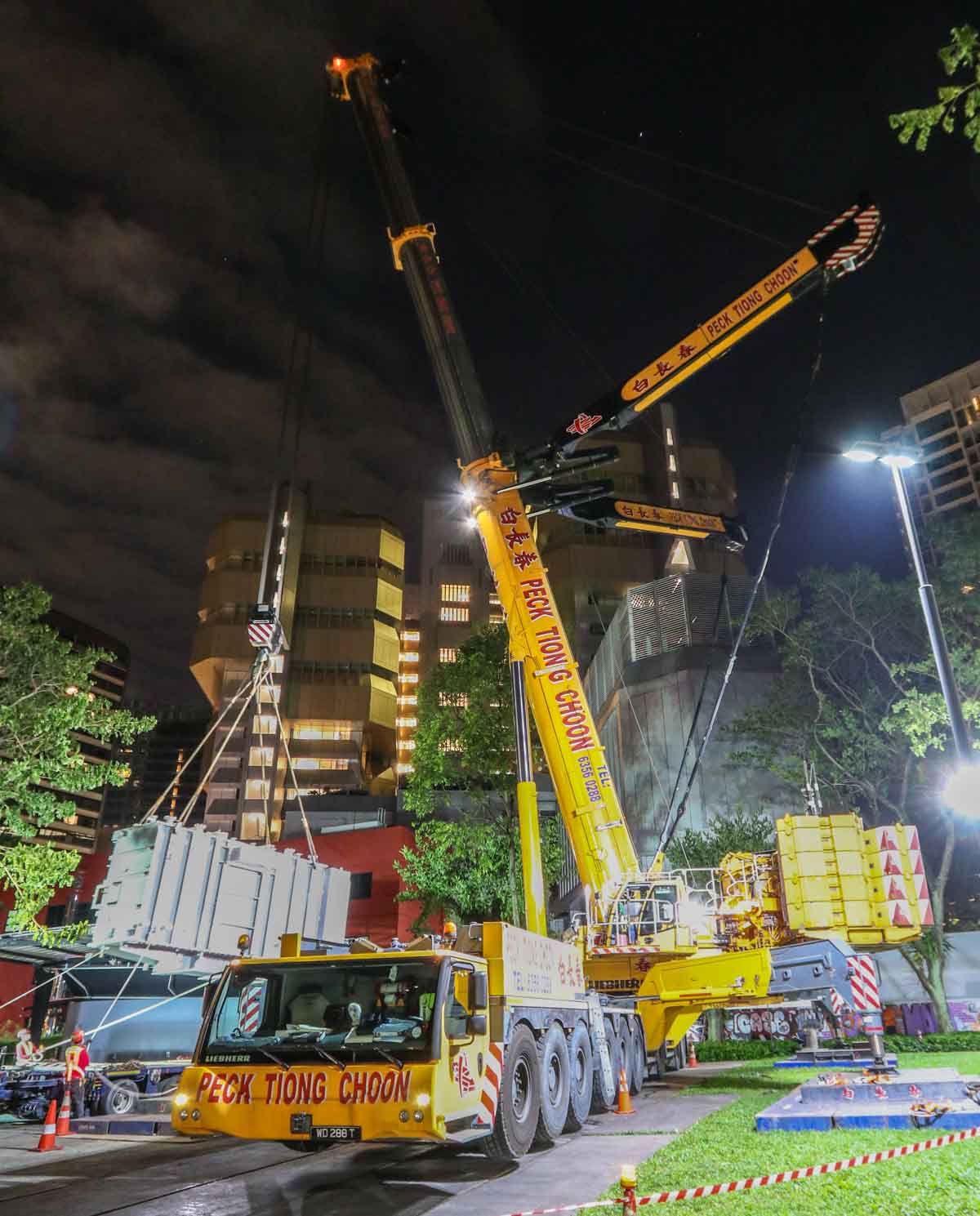 Der attraktive Liebherr LTM 1750-9.1 von Peck Tiong Choon aus Singapur (SG) wurde in den Nachtstunden eingesetzt, um zwei Transformatoren im Stadtzentrum auszutauschen. Einige Wochen zuvor wurde am gleichen Ort bereits der LTM 1750-9.1 von Moh Seng eingesetzt.
