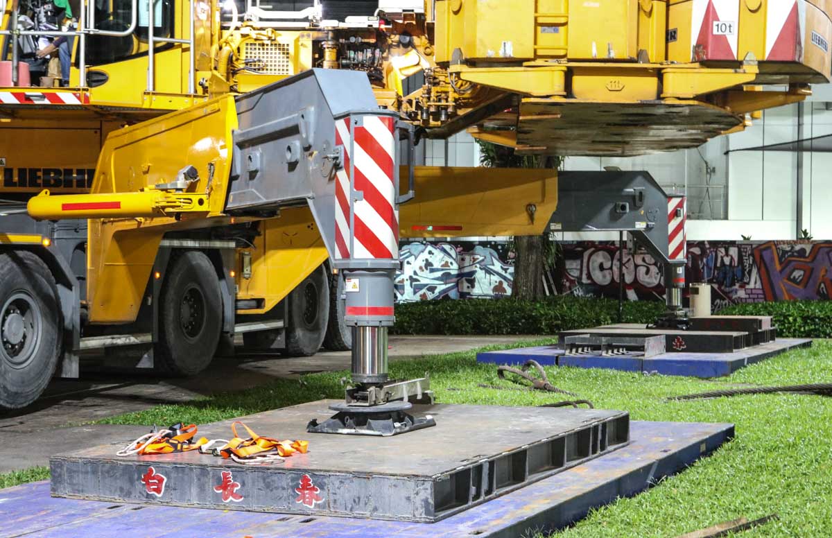 Die Abstützbasis misst 12 x 12 Meter; um die Last auf eine größere Fläche zu verteilen, werden einige Stahlplatten des Auftraggebers Yew Choon verwendet.