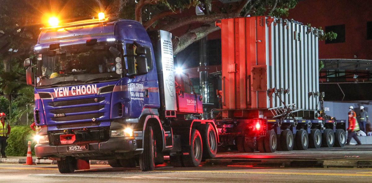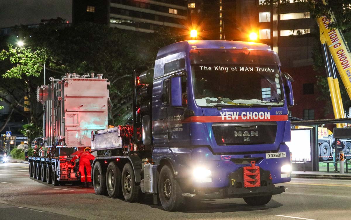 Der neue Transformator wurde von einem MAN TGX 41.680 von Yew Choon, ebenfalls auf einem 6-achsigen Goldhofer THP-Auflieger, angeliefert.
