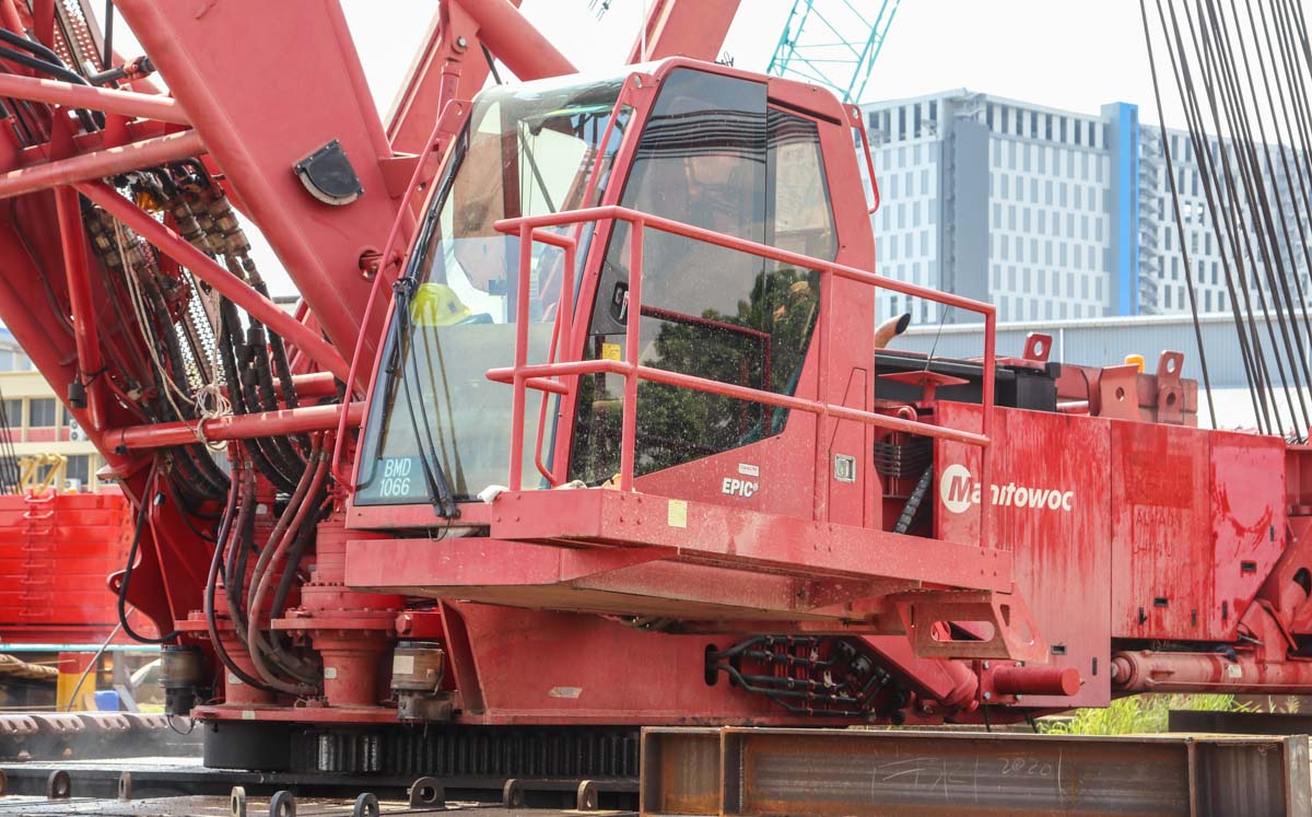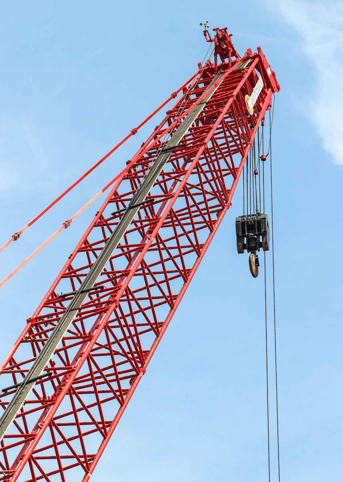 Der Kran ist mit einer 16-Tonnen-Hubwinde und einer 13-Tonnen-Hilfswinde ausgestattet, die hier beide in Betrieb sind. Am Hauptausleger ist ein großer 227-Tonnen-Lasthaken eingeschert.