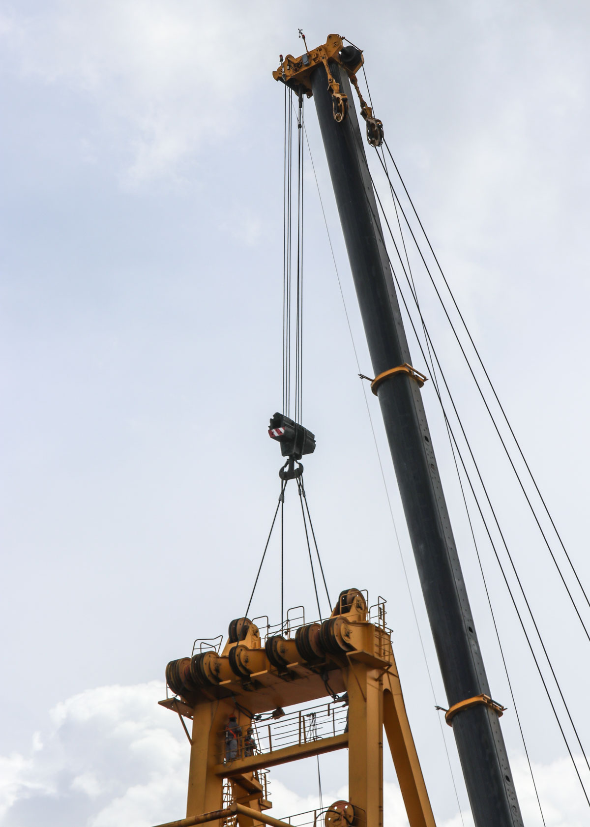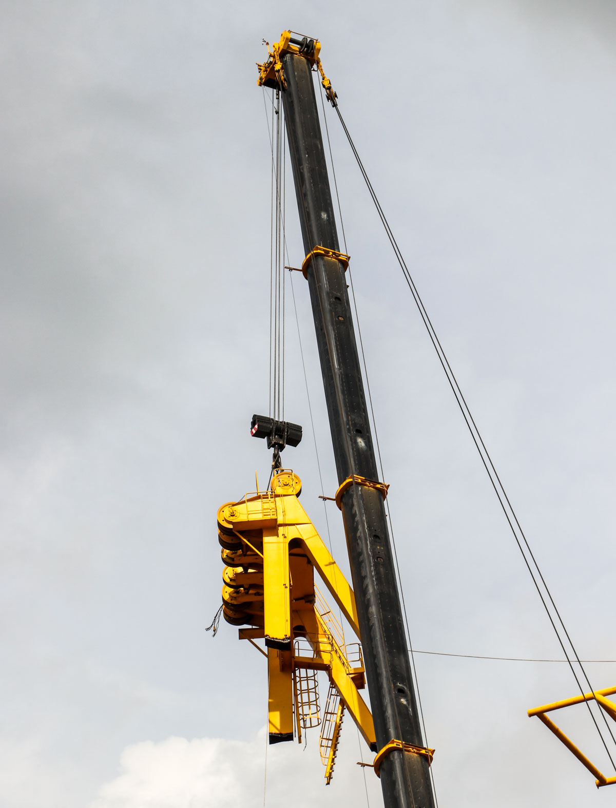 Der Kran ist mit einer 13,5-Tonnen-Hubwinde ausgeführt. Hier wurde mit einem 3-rolligen 80-Tonnen-Haken mit sechs Einscherungen gearbeitet.