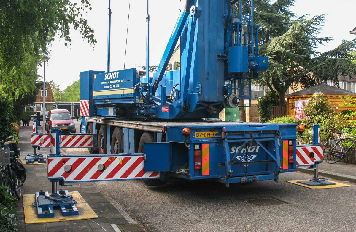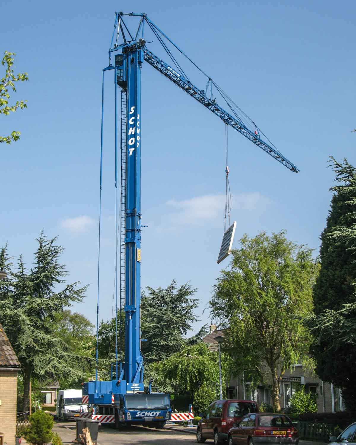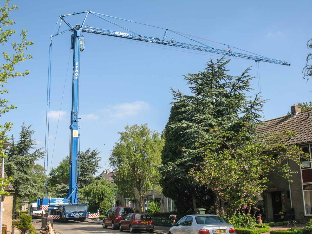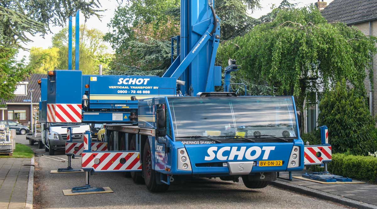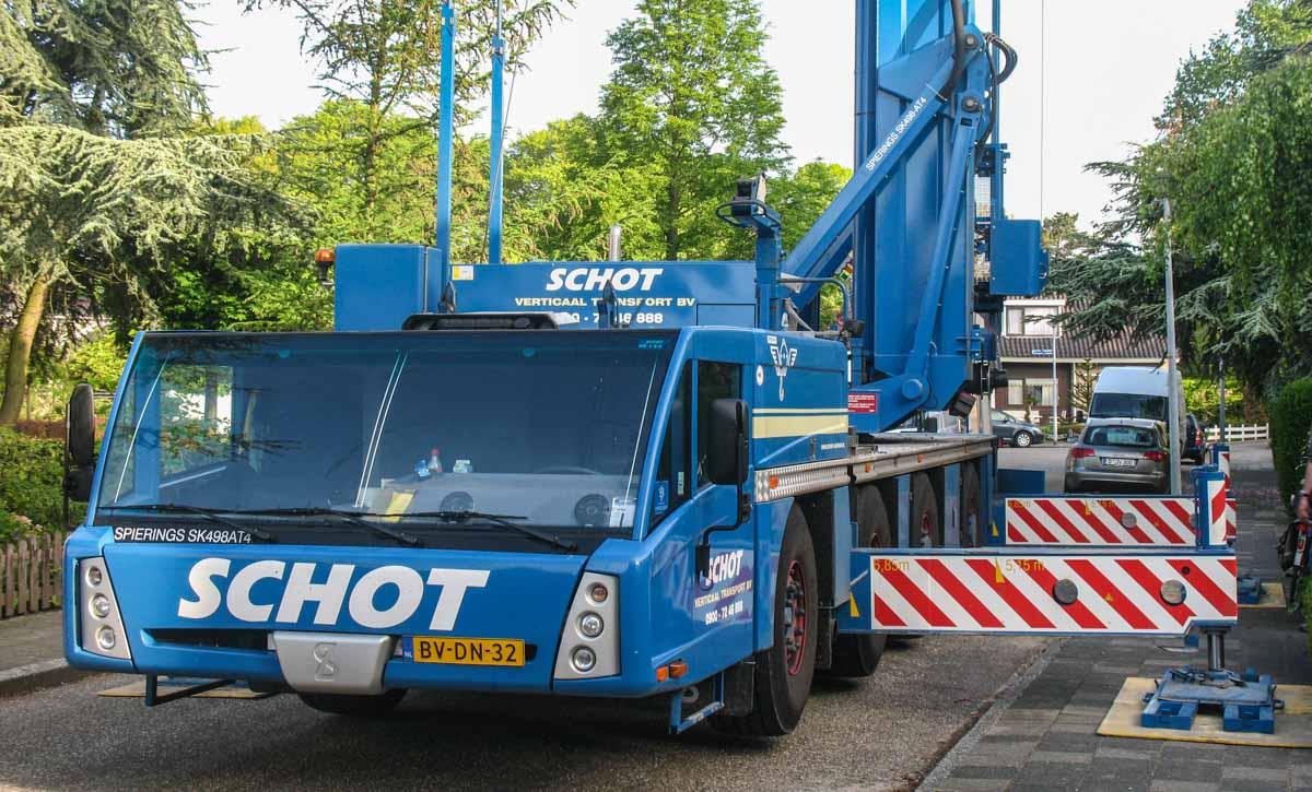 Dieser schöne Spierings SK498-AT4 von Schot aus Alkmaar (NL) wurde an einem Samstagmorgen in Medemblik (NL) eingesetzt, um Fertigteile für einen neuen Schuppen über ein Gebäude zu heben.