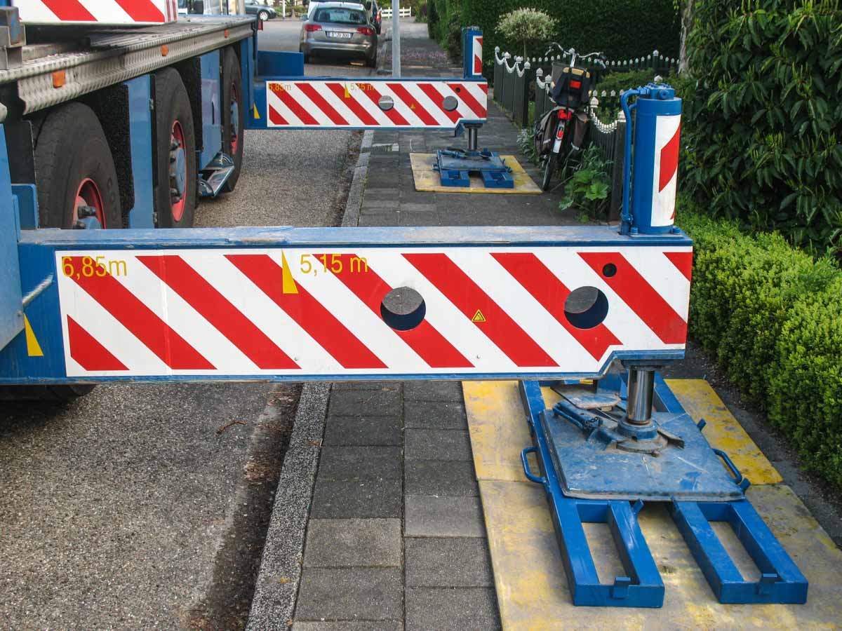 Die Abstützbasis misst 6,925 x 6,85 Meter oder 6,925 x 5,15 Meter bei halber Abstützbasis. In diesem Fall steht der Kran an einer Seite voll abgestützt und an der anderen Seite halb. Dann wird trotzdem die Hubtabelle für die halbe Abstützbasis verwendet.