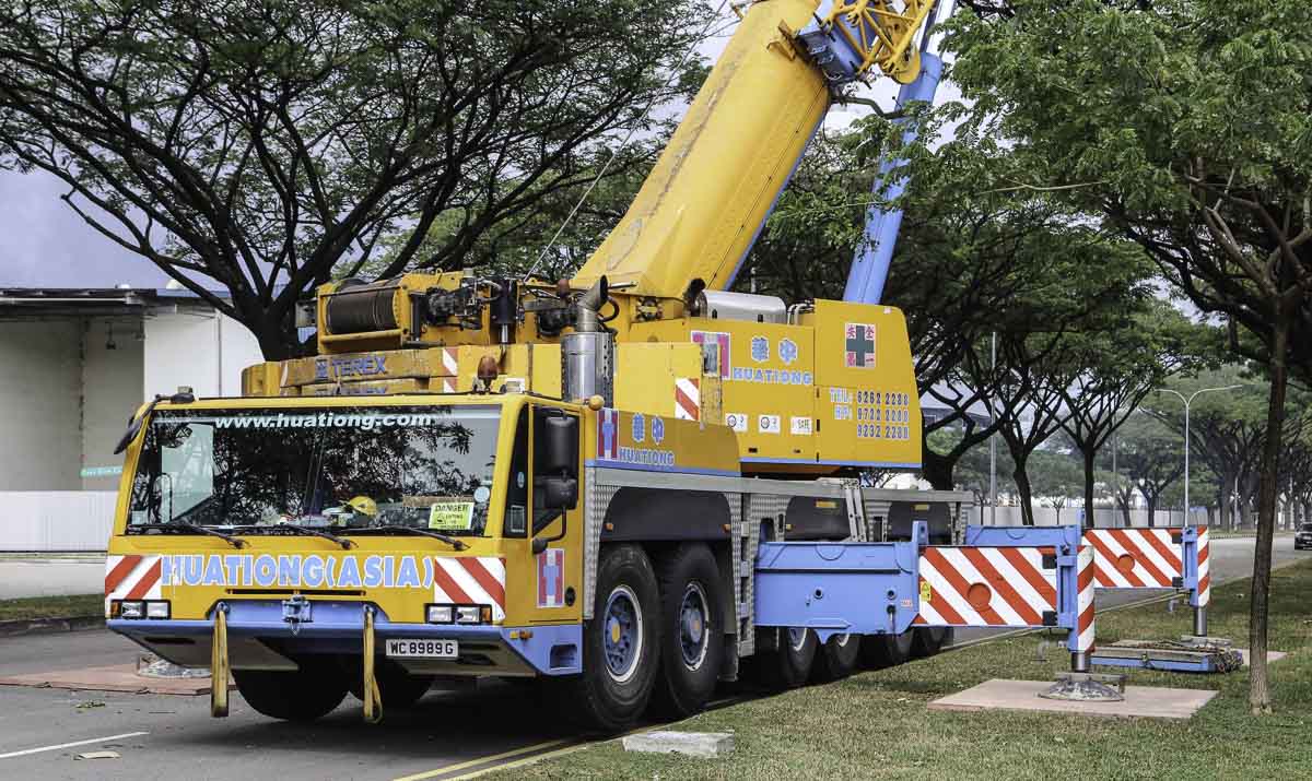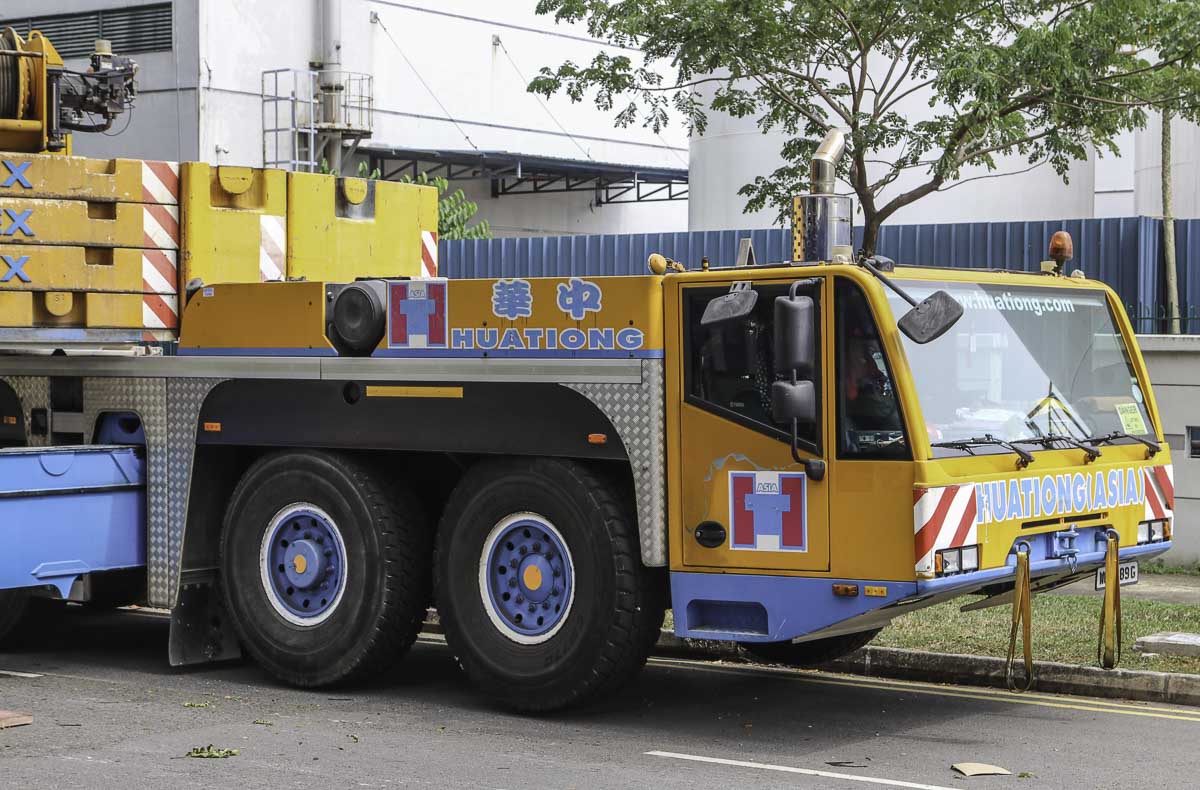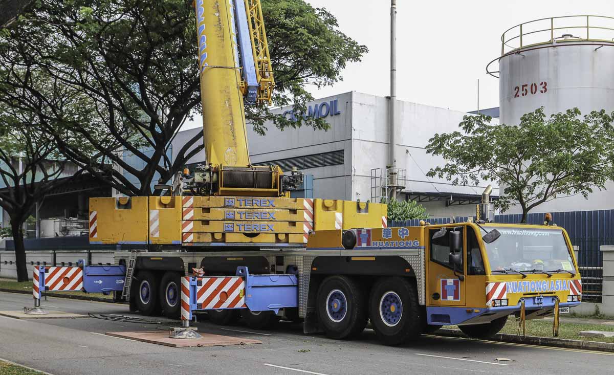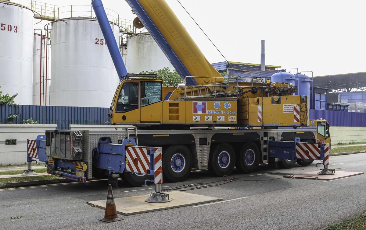 Dieser eindrucksvolle Terex AC 250-1 gehört zu Huationg (Asia) aus Singapur (SG) und wurde an einem Wochenende für Hebearbeiten in einer Fabrik eingesetzt. Es handelt sich um einen 250-Tonnen-Teleskopkran, montiert auf einem 6-achsigen Unterwagen.