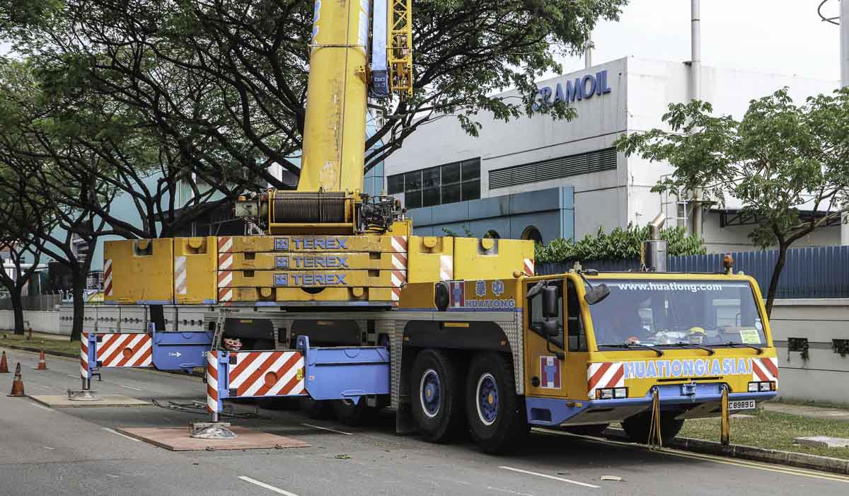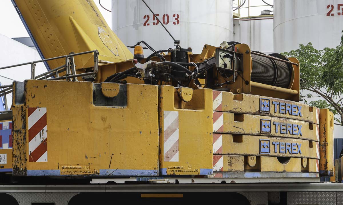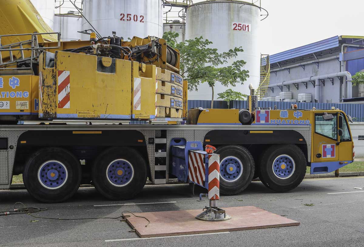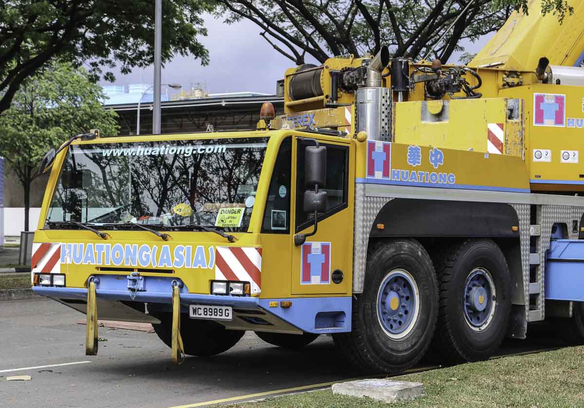 Dieser eindrucksvolle Terex AC 250-1 gehört zu Huationg (Asia) aus Singapur (SG) und wurde an einem Wochenende für Hebearbeiten in einer Fabrik eingesetzt. Es handelt sich um einen 250-Tonnen-Teleskopkran, montiert auf einem 6-achsigen Unterwagen.