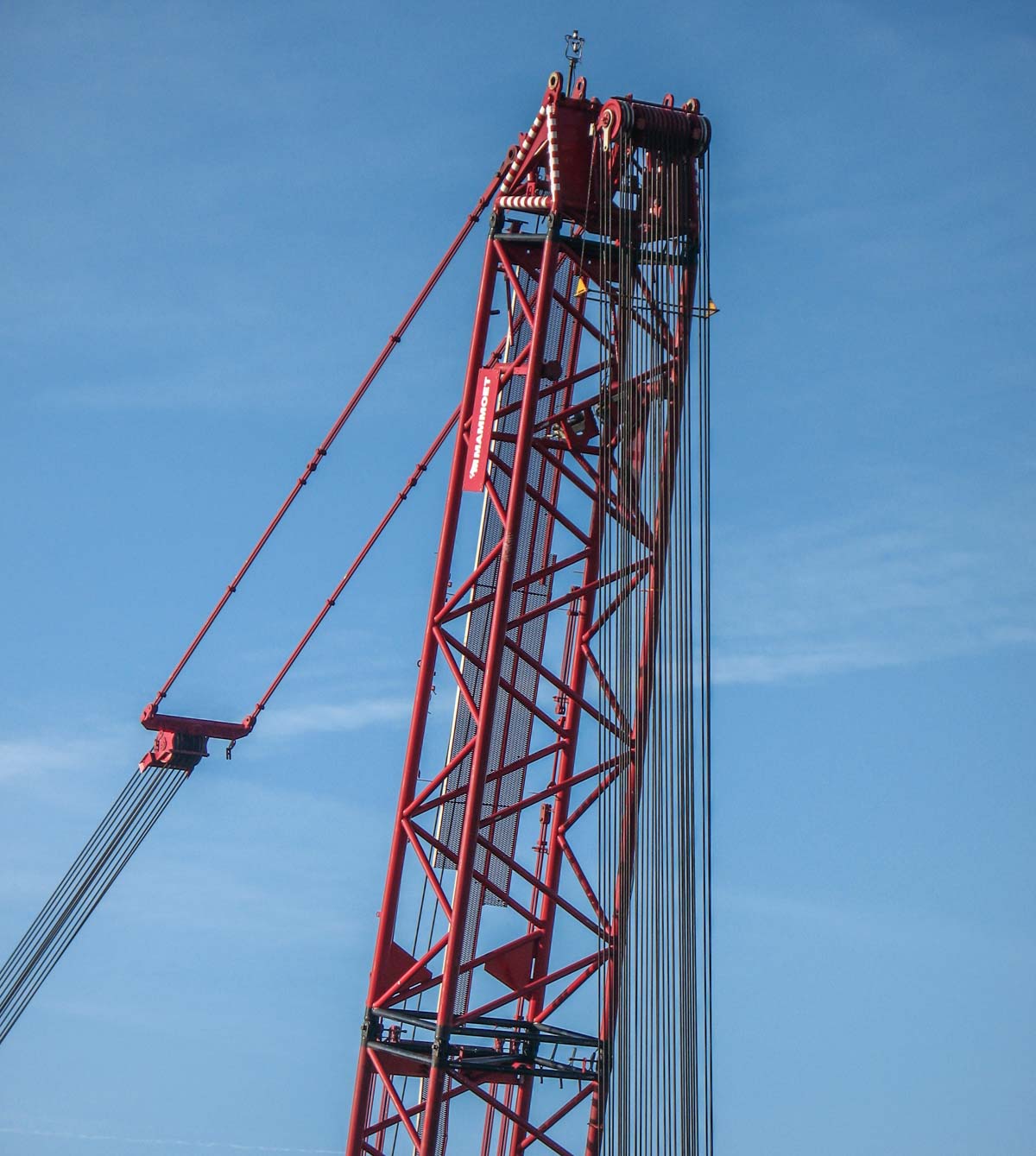Hier war der Kran mit einem 600-Tonnen-Liebherr-Haken konfiguriert, was in der Regel möglich ist, wenn das Hubseil denselben Durchmesser hat. Der Haken war auf 30 Einscherungen gesetzt und hat ein Eigengewicht von etwa 16 Tonnen.
