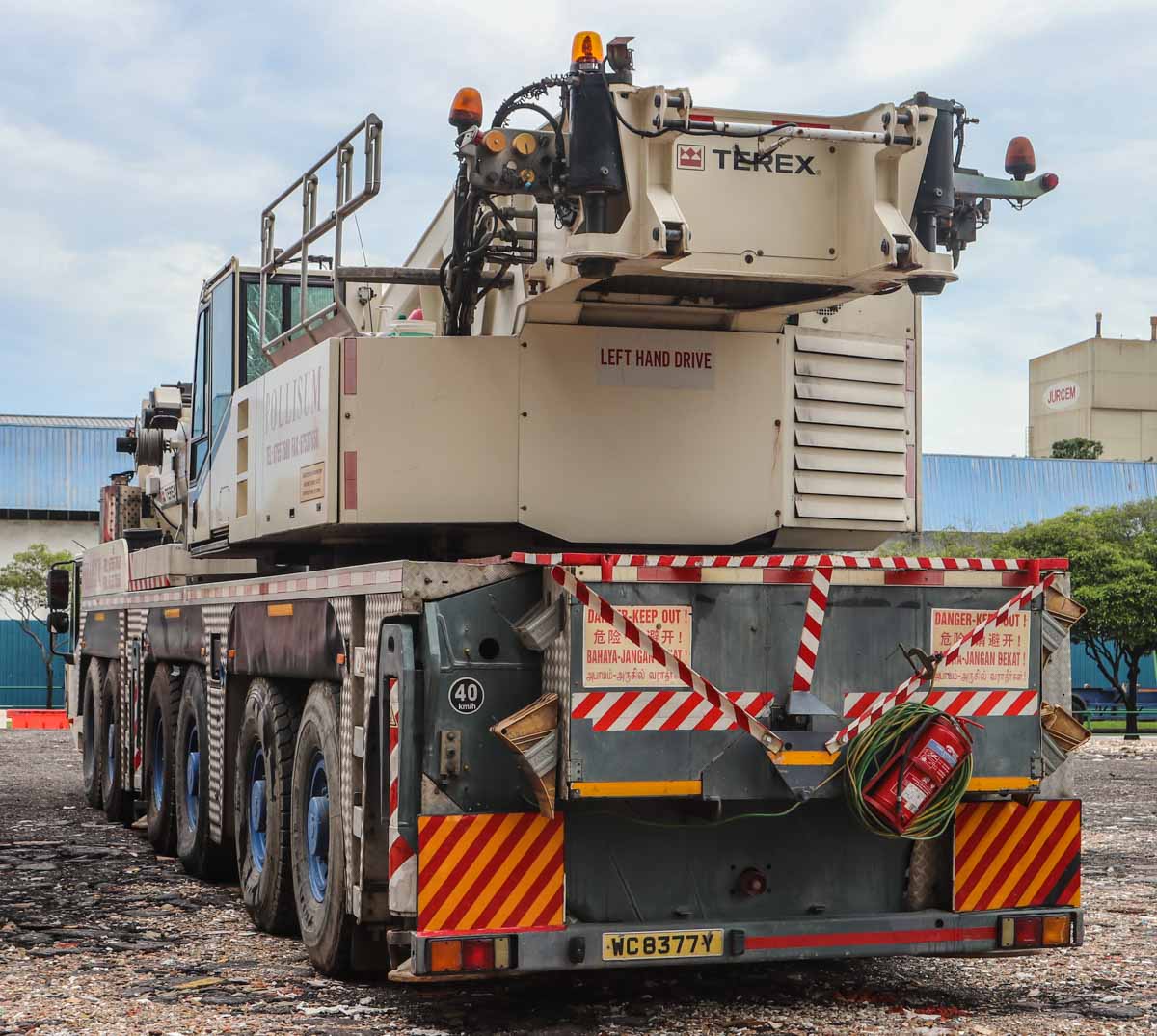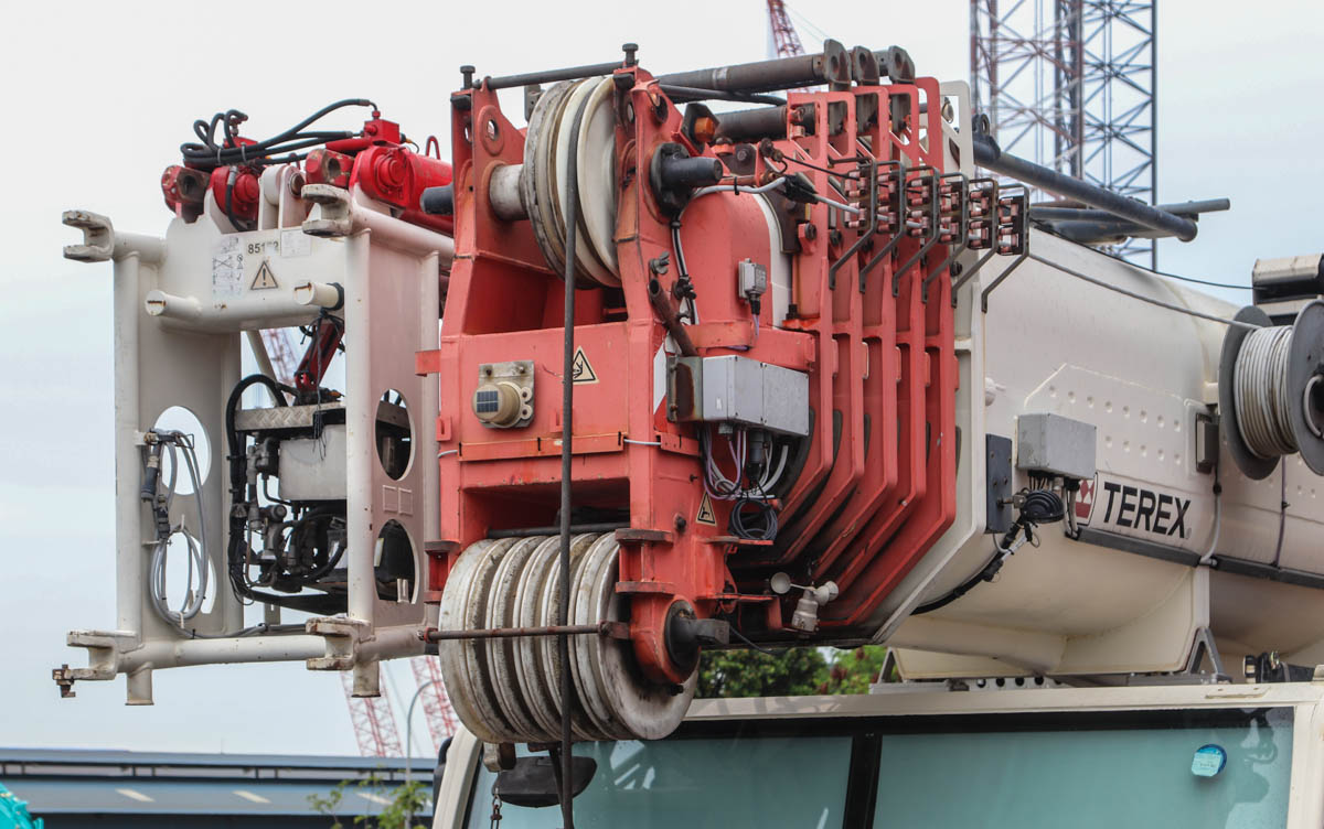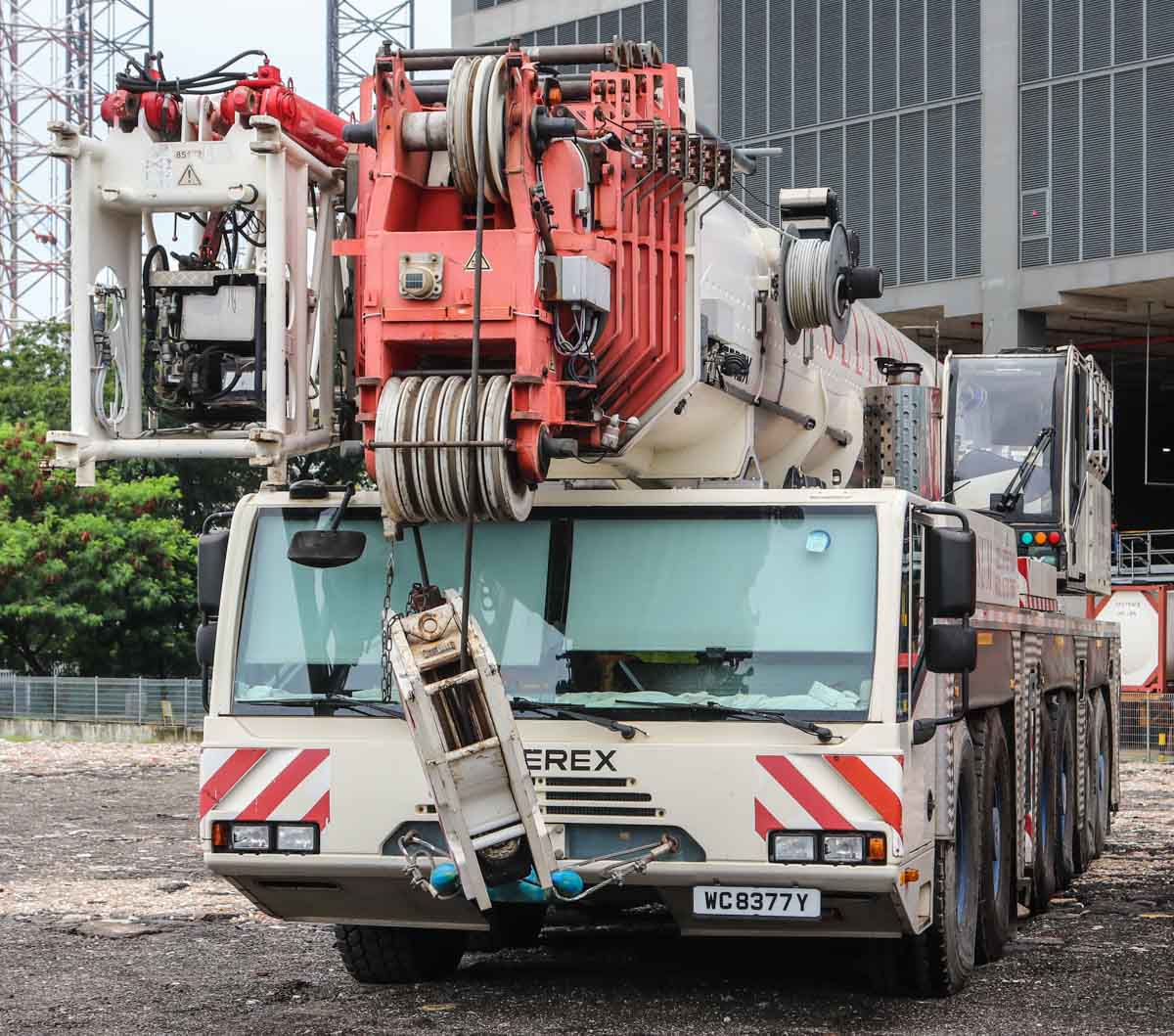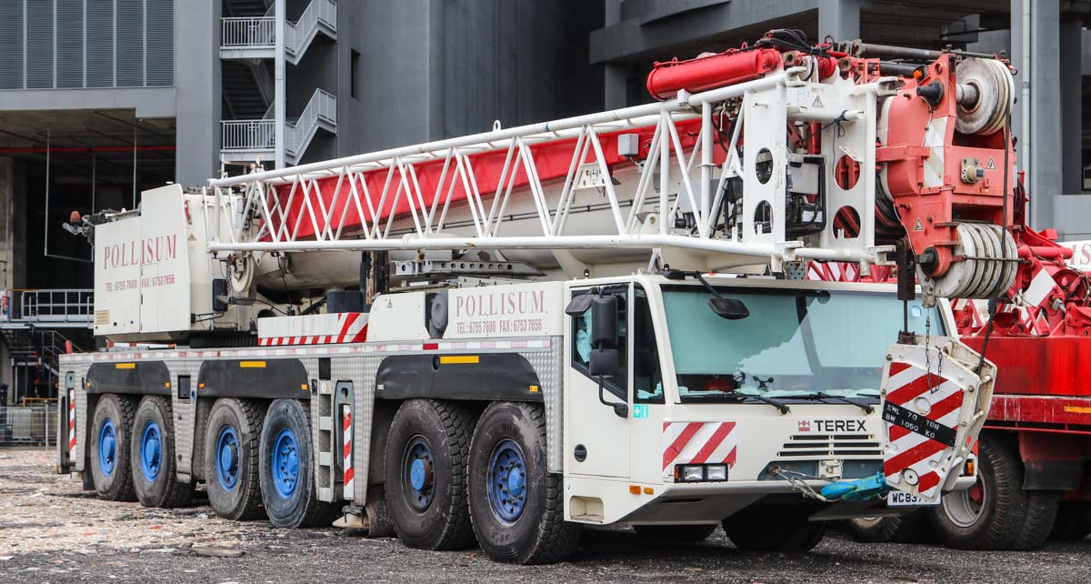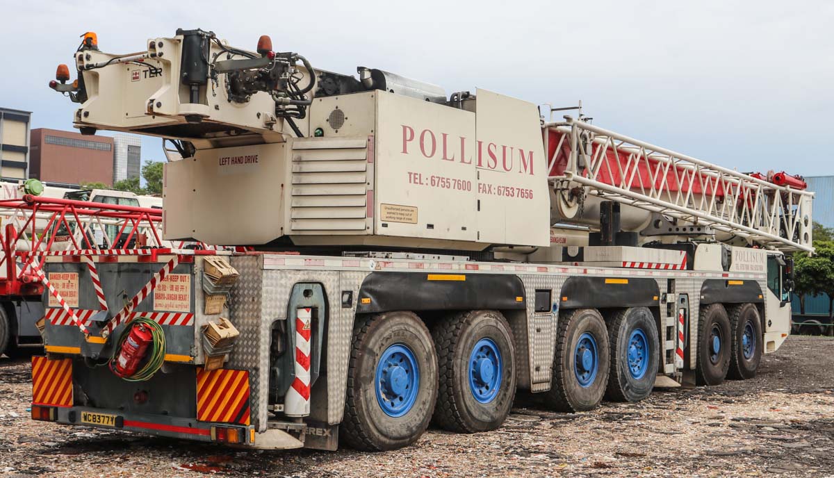 Dieser attraktive Terex AC 250-1 gehört Pollisum aus Singapur (SG) und stand auf einem Betriebshof geparkt. Es handelt sich um einen 250-Tonnen-Mobil-Teleskopkran, der auf einem sechsachsigen Unterwagen montiert ist.