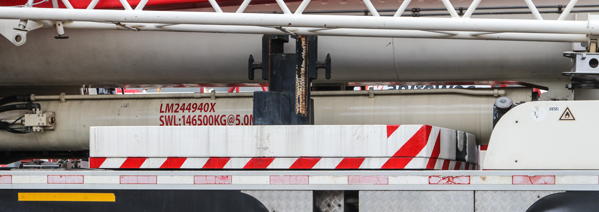 Während des Straßentransports werden 15 Tonnen Ballast auf dem Unterwagen mitgeführt. Der komplette Ballast wiegt 96,6 Tonnen und hat einen Drehkreis von 5,6 Metern.