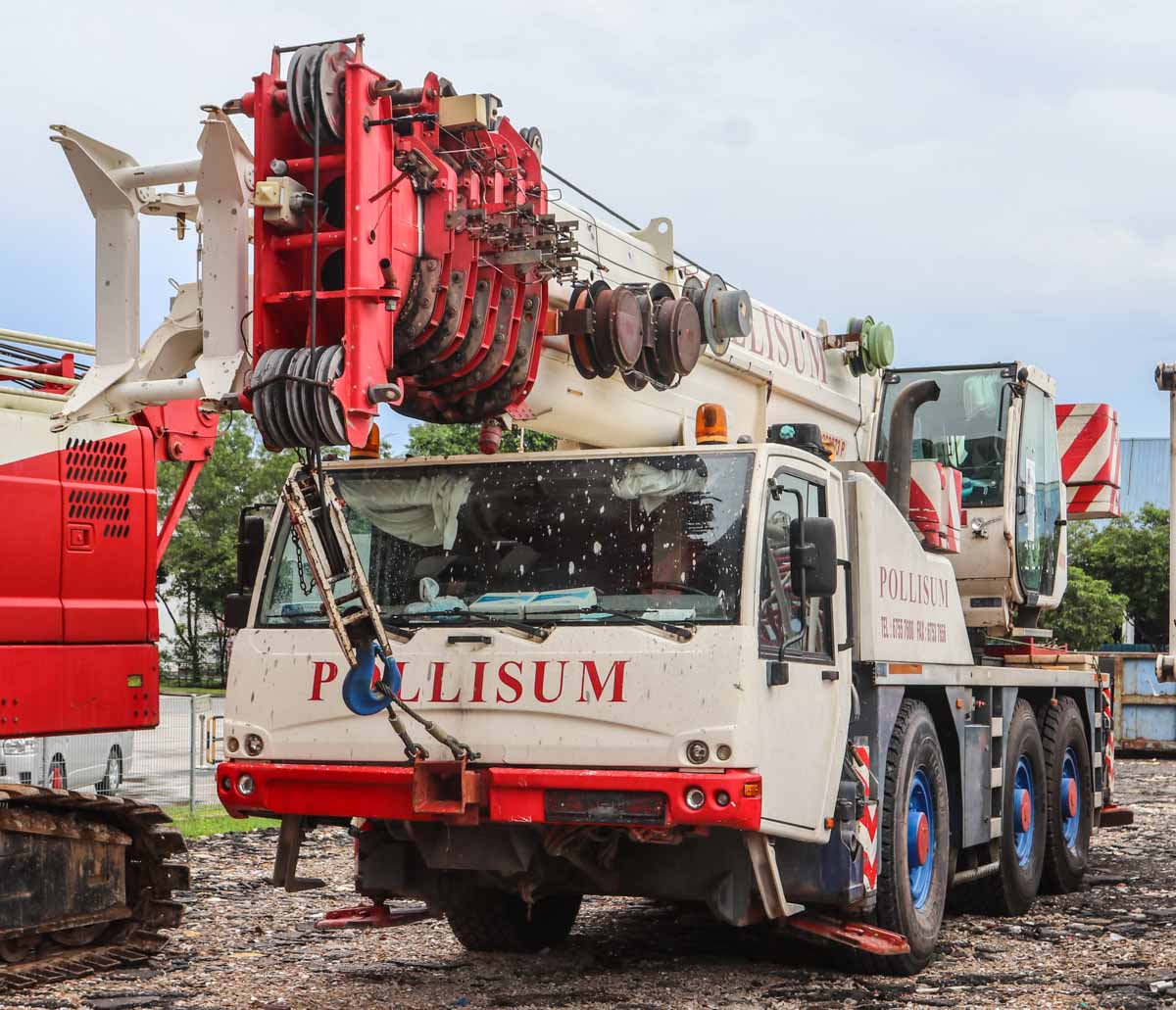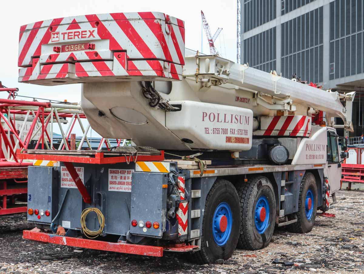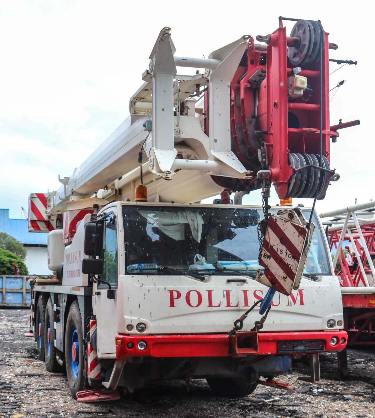 Dieser interessante Terex AC 55 L ist von Pollisum aus Singapur (SG). Es ist ein 55-Tonnen-Teleskopkran, montiert auf einem 3-achsigen Unterwagen. Das Baujahr des Krans ist 2010, wird aber erst seit 2013 von Pollisum eingesetzt.