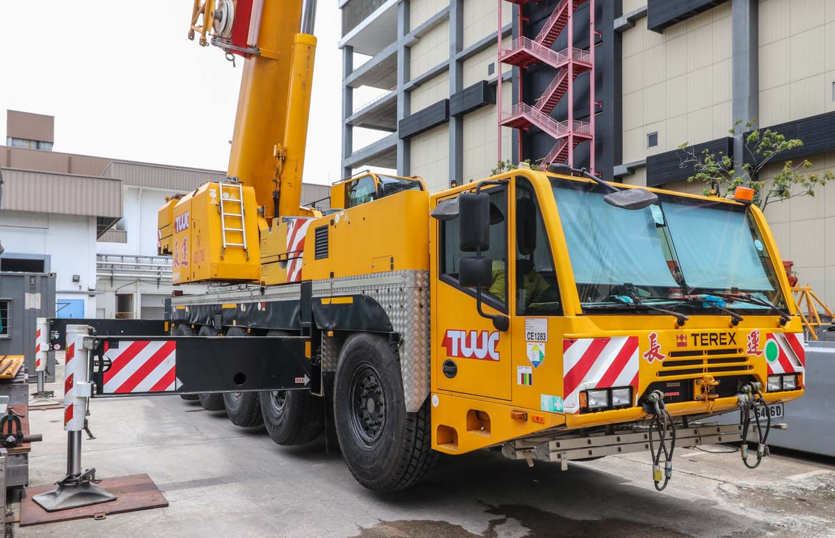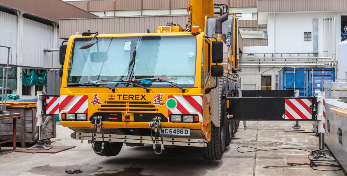 Dieser beeindruckende Terex AC 100 von Tiong Woon aus Singapur (SG) wurde auf einem Lagerplatz für neue Baumaschinen für leichte Arbeiten eingesetzt. Es handelt sich um einen 100-Tonnen-Teleskopkran, der auf einem fünfachsigen Unterwagen montiert ist.
