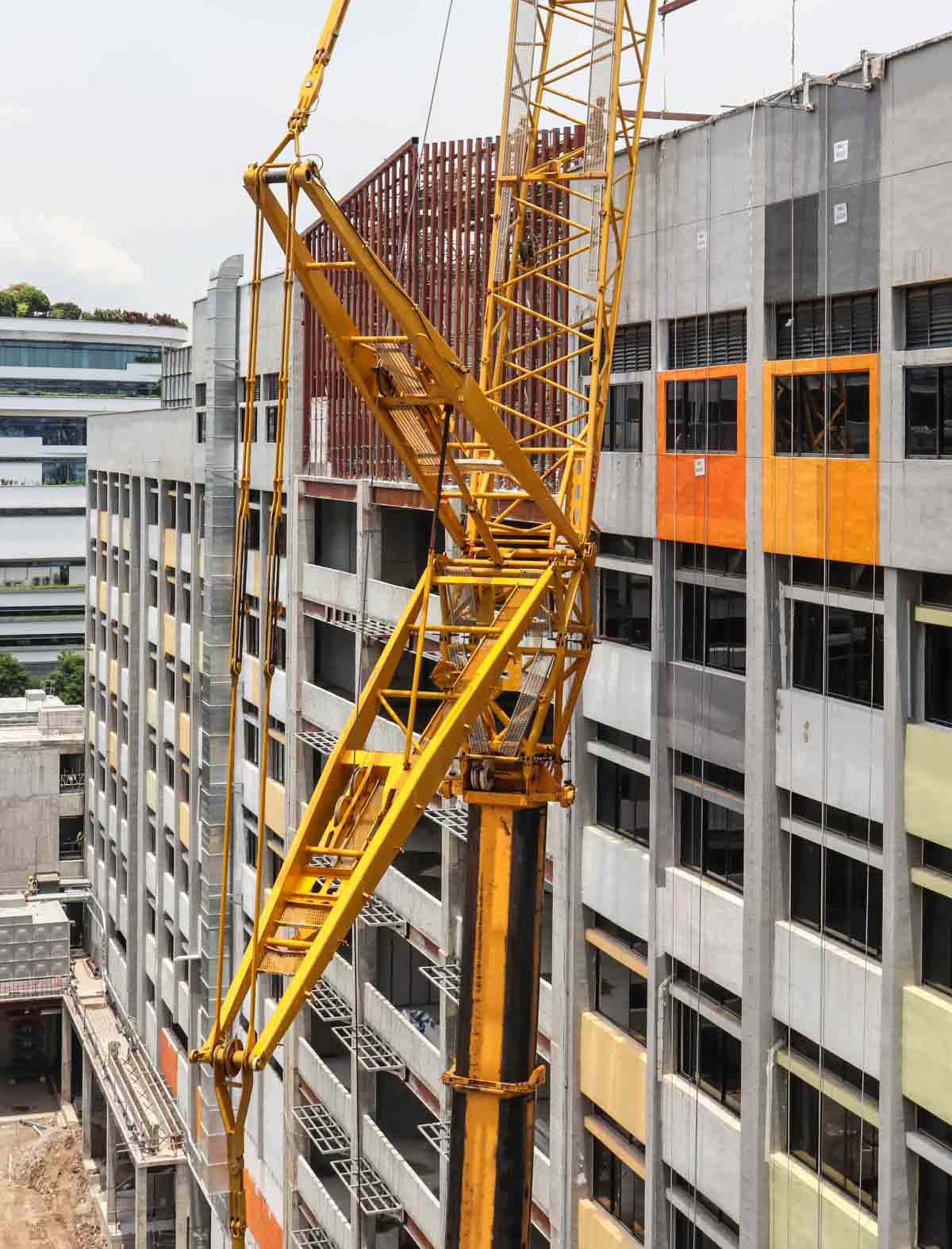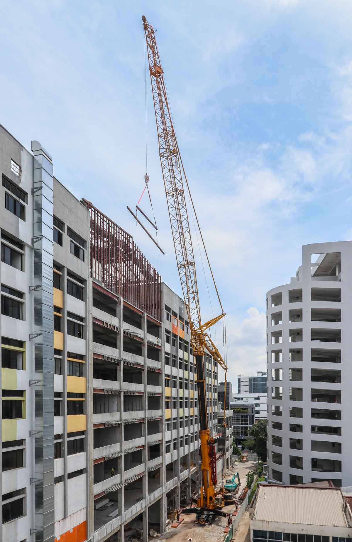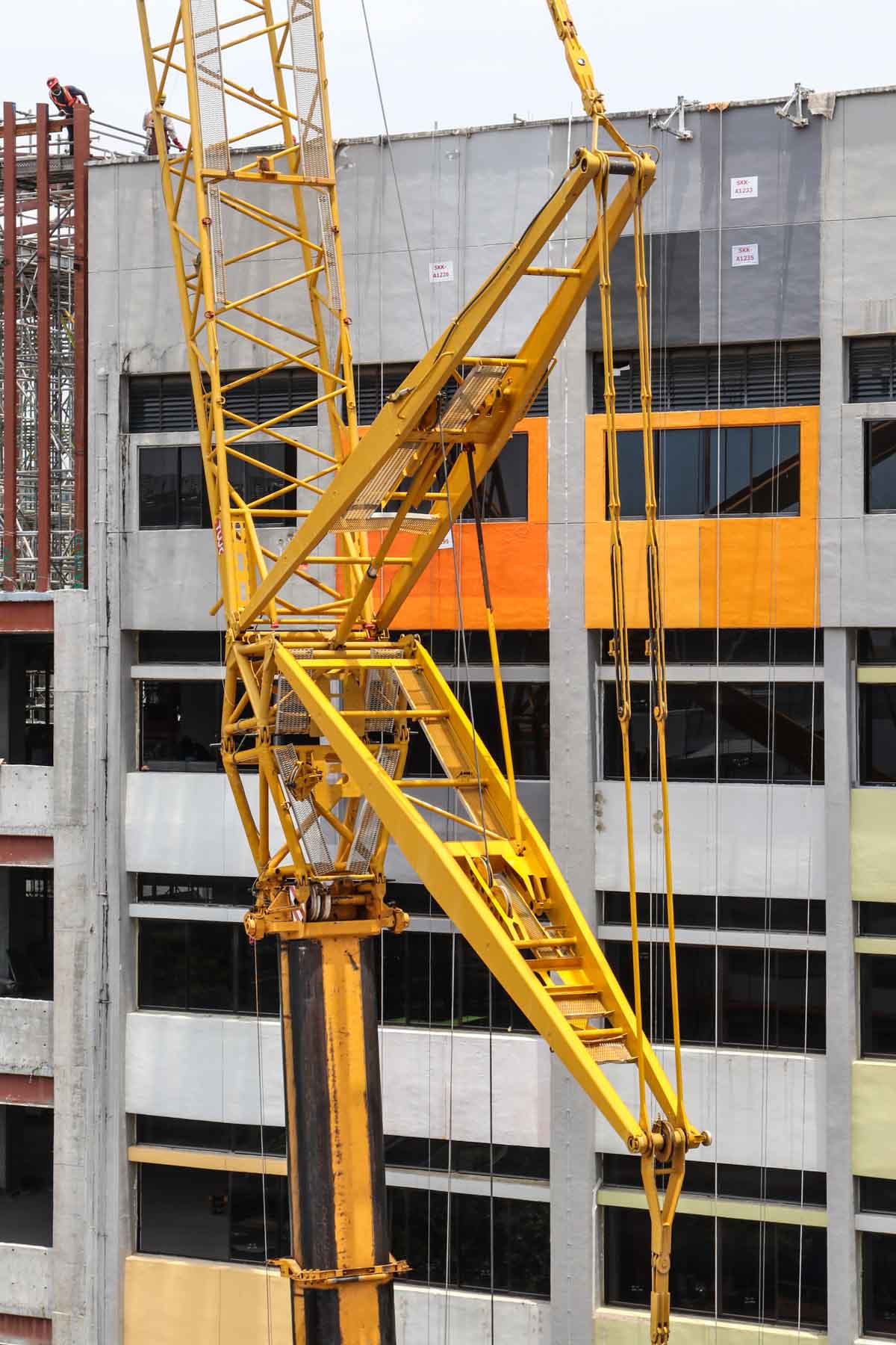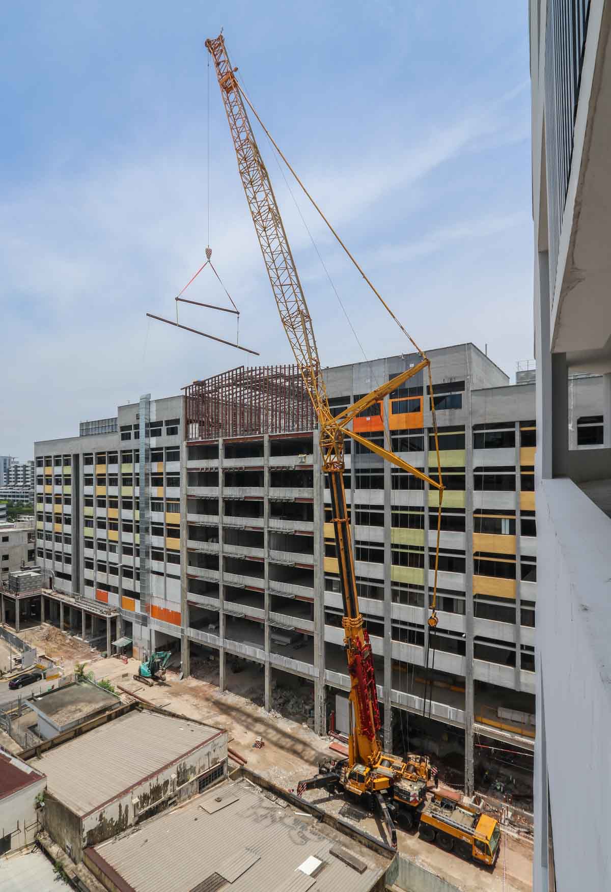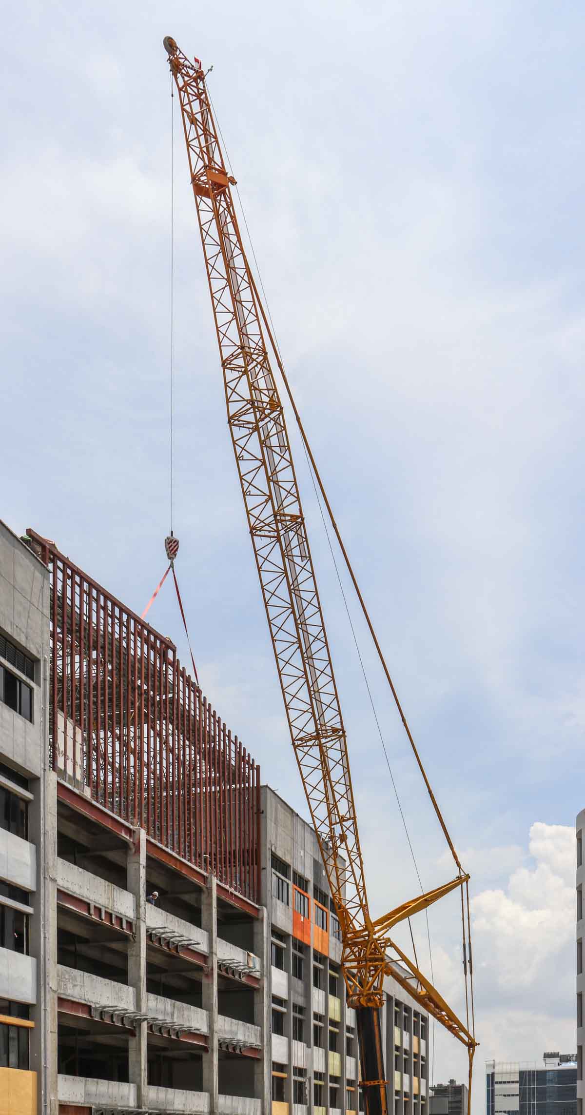Der Hauptausleger ist hier auf eine Länge von 28,6 Metern ausgefahren. Die letzten Stahlträger mussten bei minimaler Ausladung montiert werden. Ein beeindruckender Kran von Tiong Woon!