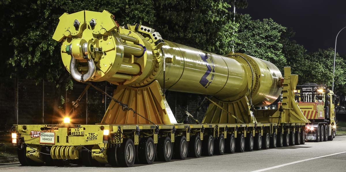 Die Ladung ist ein Menck MHU1200S Hydraulikhammer mit einem Gesamtgewicht von 149 Tonnen.