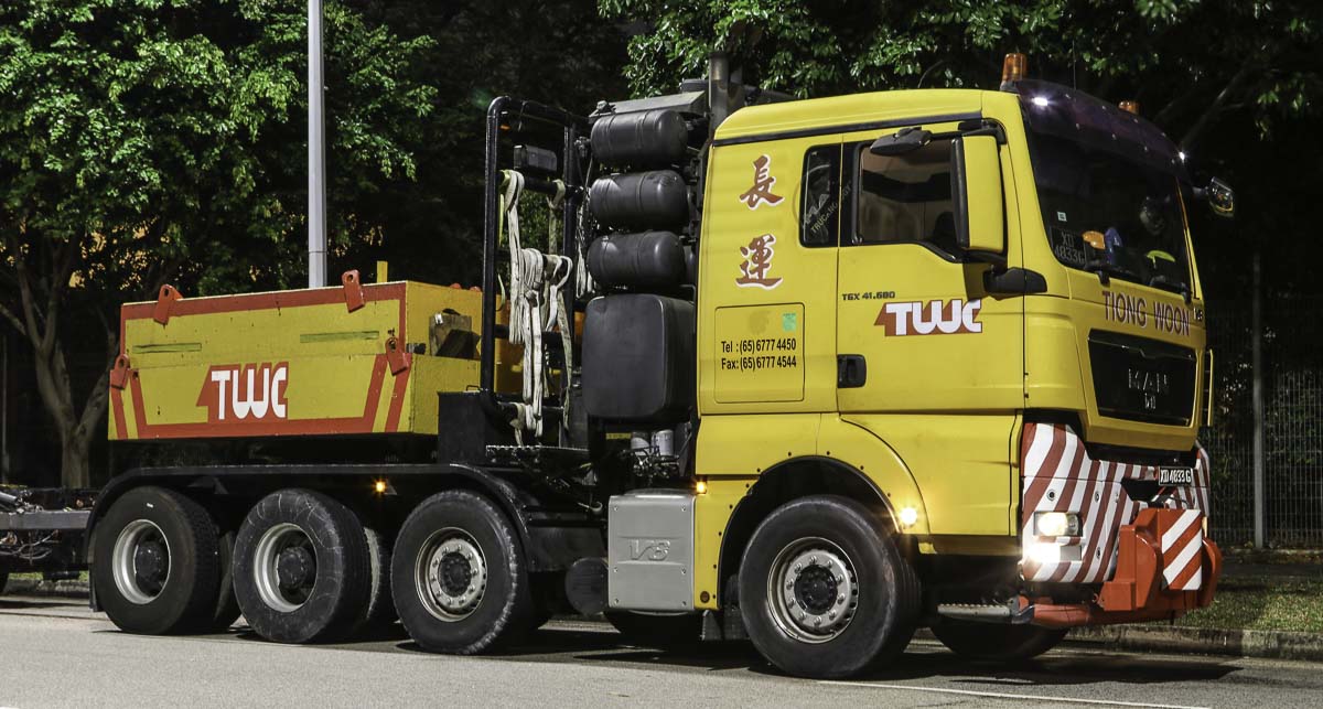 Tiong Woon betreibt die Zugmaschine international, die Zugmachine war kurz vor diesen Einsatz aus der Brunei zurückgekommen. Tiong Woon betreibt zwei von diesen Zugmaschinen, die andere hat eine weiße Kabine.