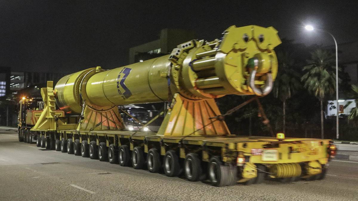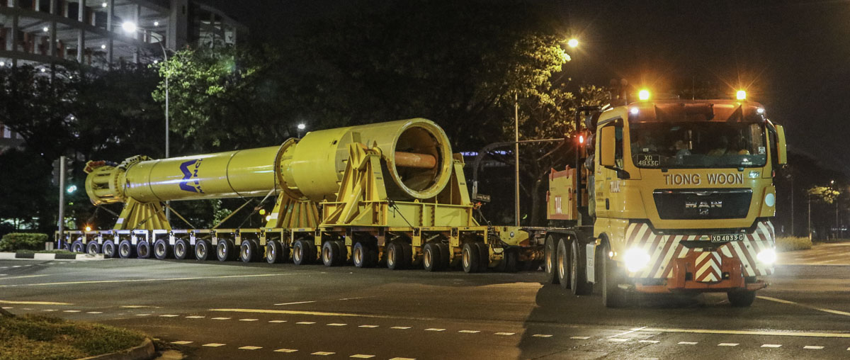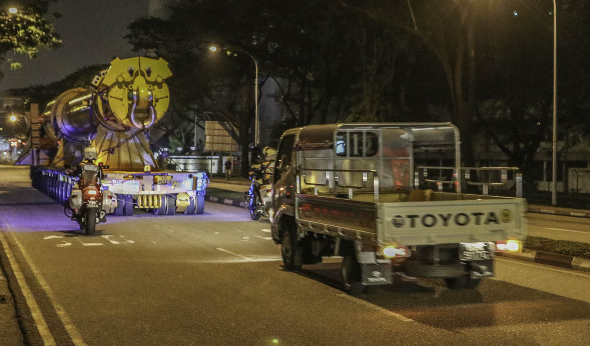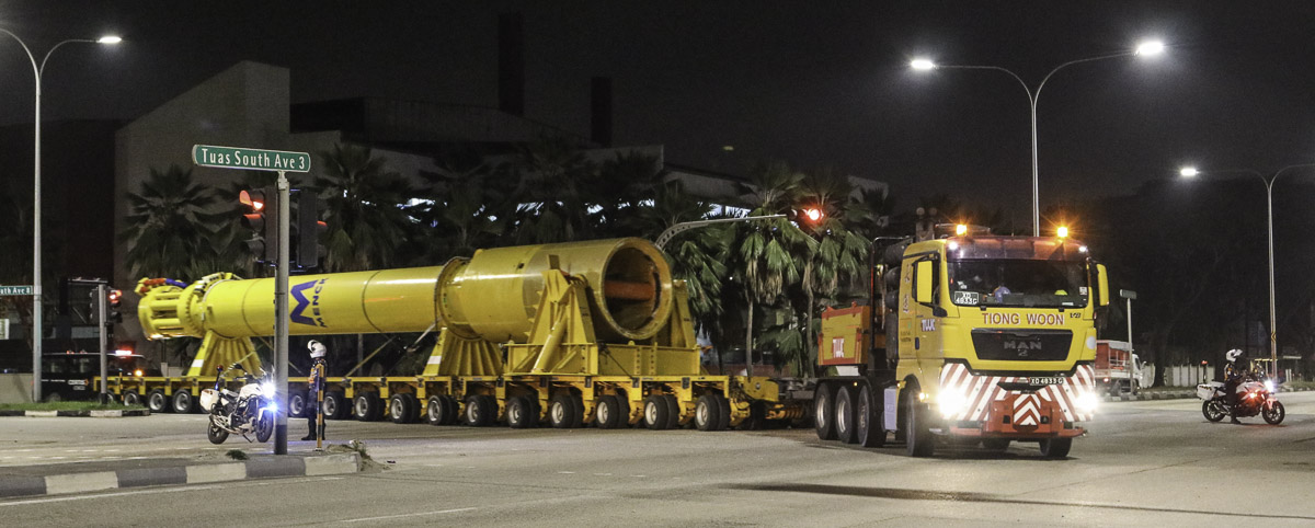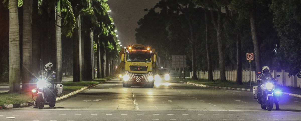 Wegen der Abmessungen und Gewichte darf der Transport nur unter Begleitung zum anderen Hafen fahren. In diesem Fall erst nach 22:00 Uhr. Ein sehr schöner Transport von Tiong Woon!