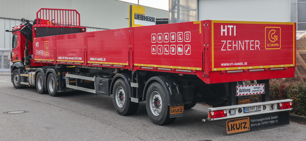 Ein 2-achsiger Kurz-Auflieger mit Pritsche und Bordwänden ist angekuppelt. In diesem Fall war die Kombination leer.