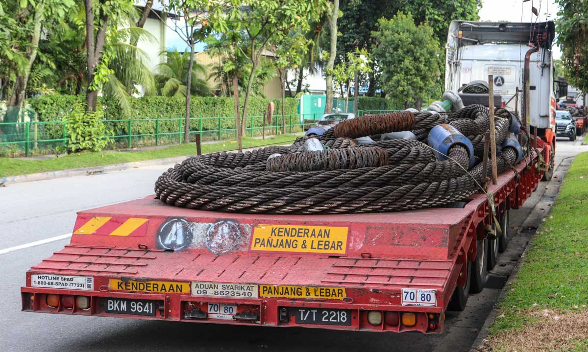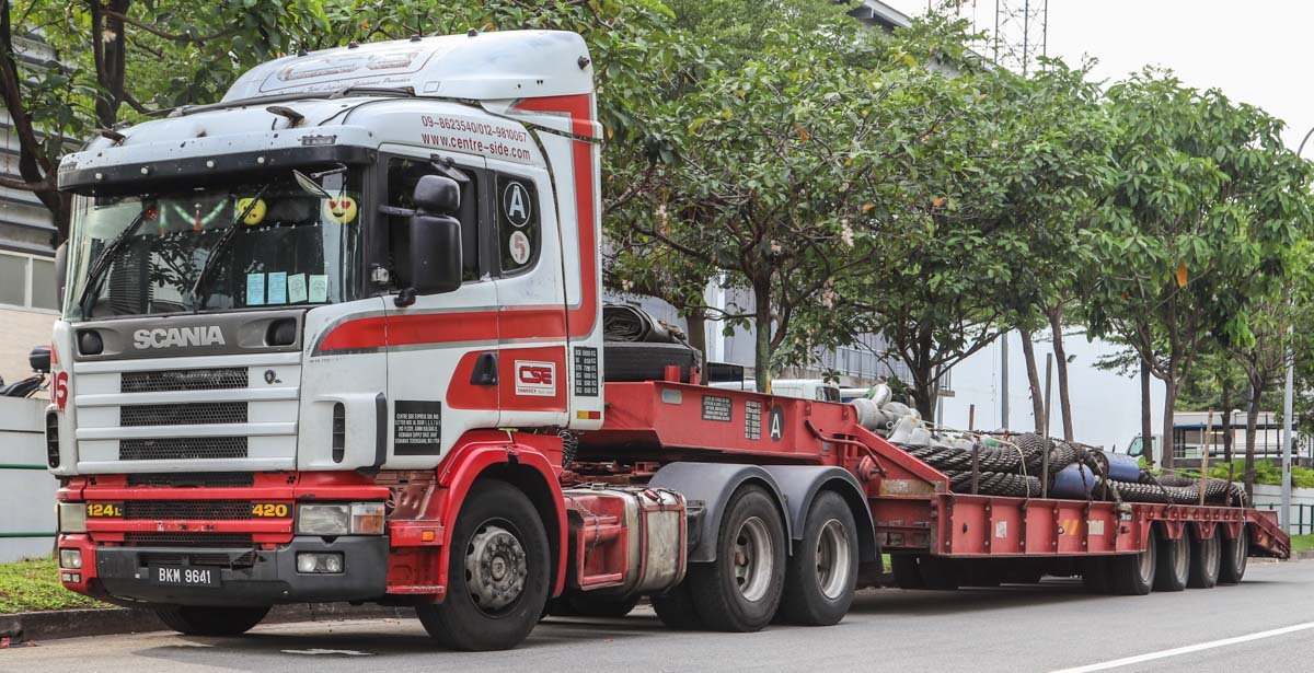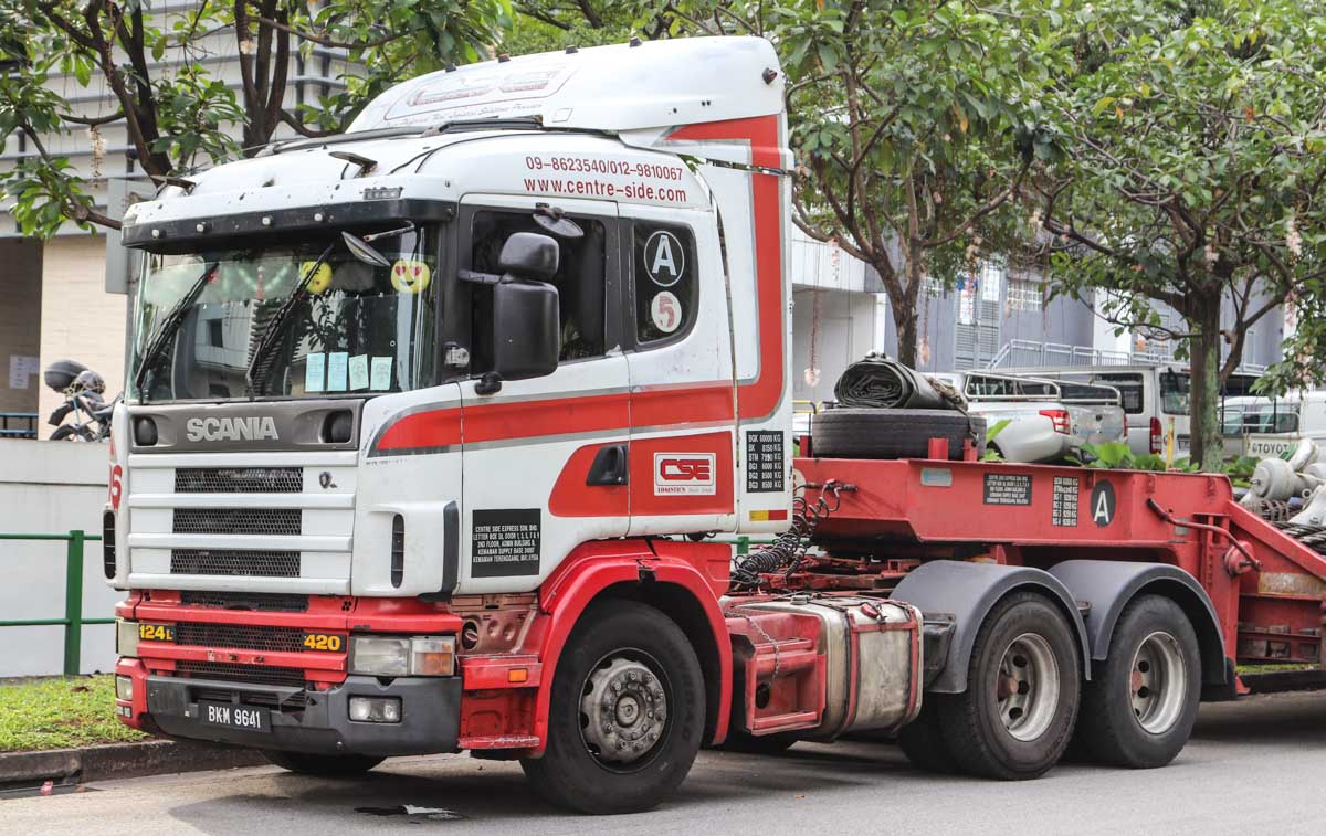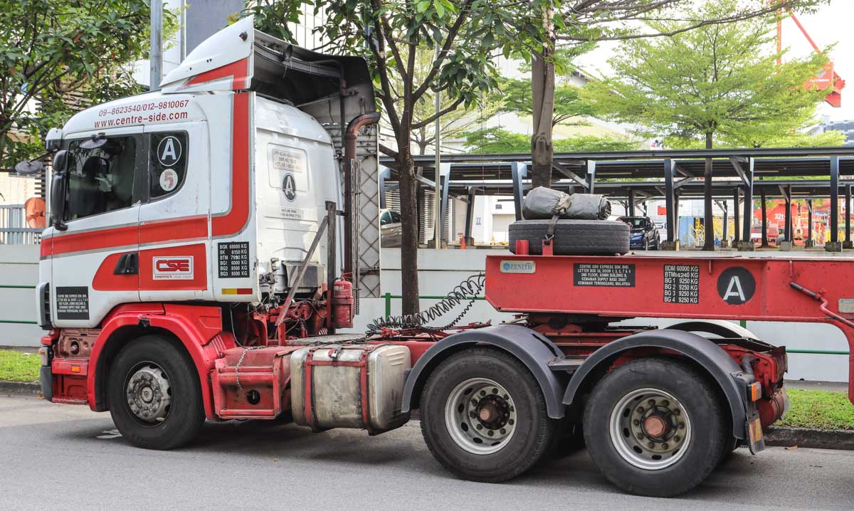 Diese schöne Scania 124 L 420 von Centre Side Express aus Kemaman (MY) brachte mit einem 4-achsigen Auflieger eine schwere Ladung nach Singapur (SG). Hier war die Kombination am Straßenrand abgestellt.