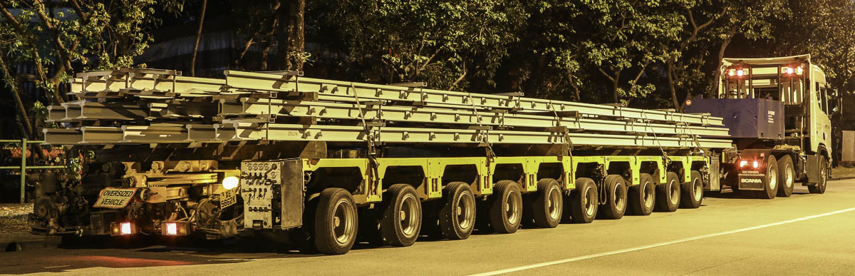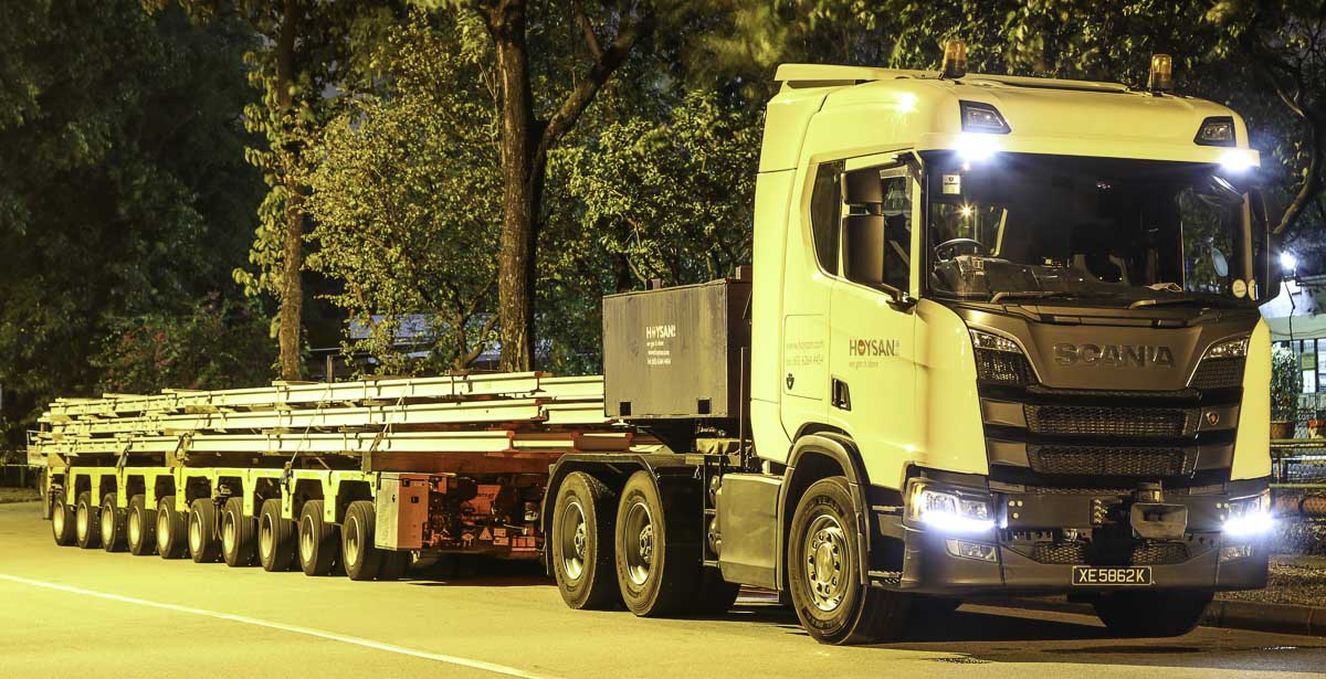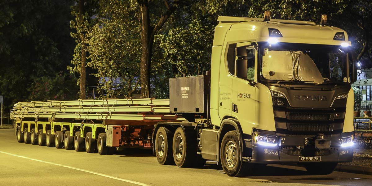 Hier stand die eindrucksvolle Scania R 730 von Hoysan aus Singapur (SG), die mit einem 10-achsigen Cometto-Anhänger und Ladung am Straßenrand geparkt war. Es musste auf die Transportbegleitung gewartet werden.