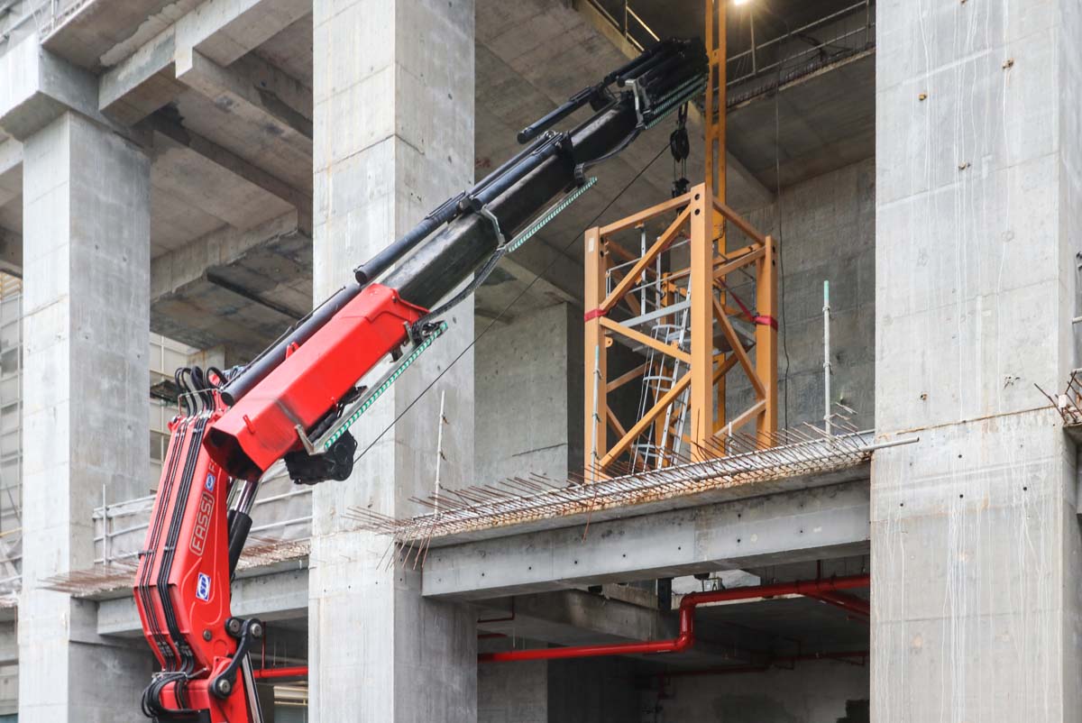 Mit dieser Last kann eine Ausladung von etwa 11,5 Metern erreicht werden. Die Herausforderung bestand hier darin, das Turmstück vertikal aus dem Gebäude zu heben.