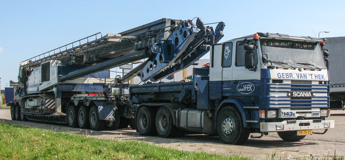 Van 't Hek aus Z.O. Beemster (NL) verfügte über diese beeindruckende und sehr attraktive Scania 143 E 500, die primär mit Ballastpritsche zum Ziehen eines 6-achsigen Anhängers eingesetzt wurde. Die gesamte Kombination wurde von B.Q. de Ruyter aus Amsterdam (NL) übernommen.