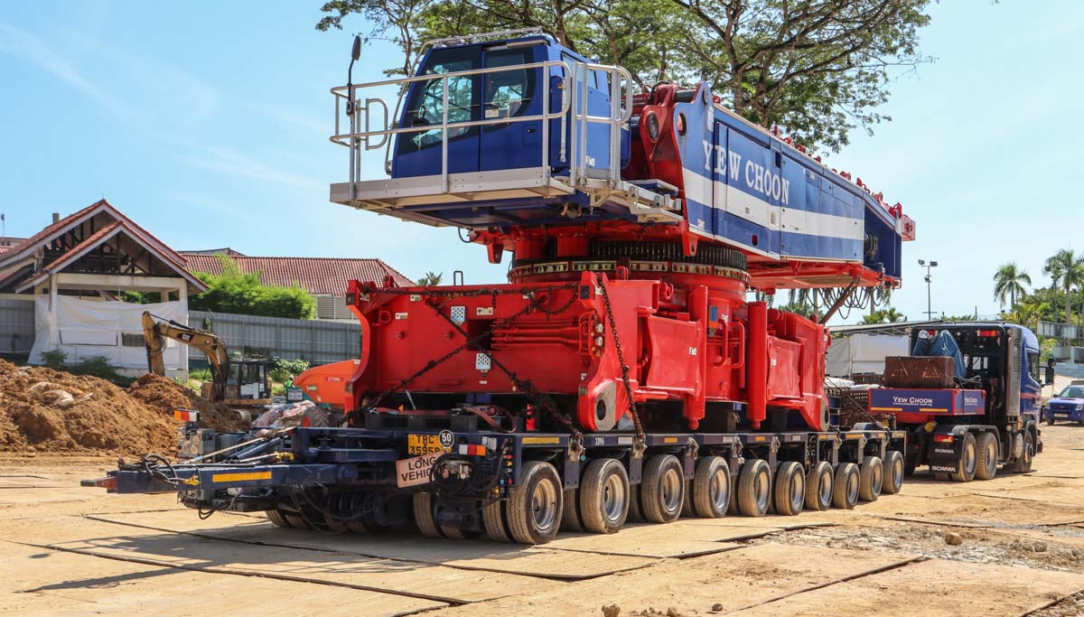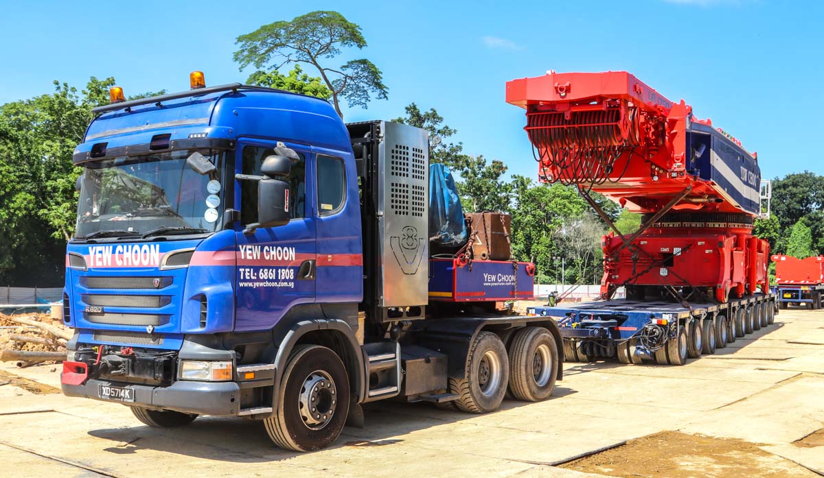 Hier wurde der schöne Scania R 620 von Yew Choon aus Singapur (SG) für den Transport eines Raupenträgers des neuen Liebherr LR 1750/2 von Yew Choon eingesetzt.