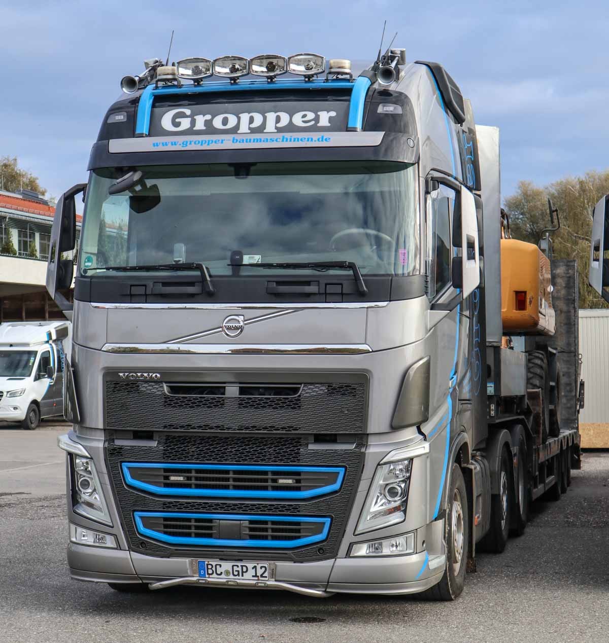 Dieser attraktive Volvo FH 540 gehört Gropper Baumaschinen aus Ummendorf (DE) und stand während eines Wochenendes auf einem Industriegelände geparkt. Die Kombination besteht aus einer 3-achsigen Zugmaschine mit einem 3-achsigen Auflieger.