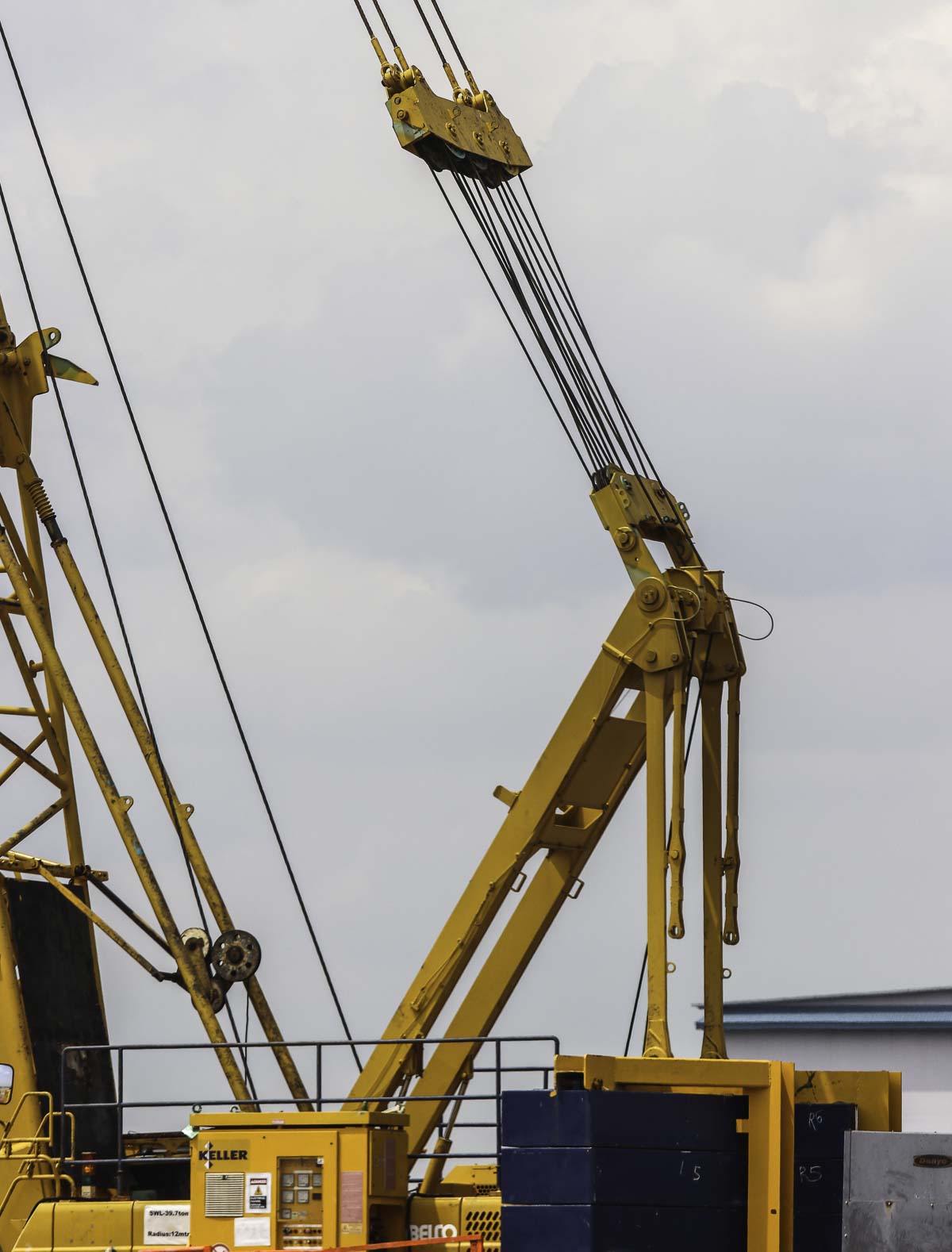 Im Kran hägt ein großer Rüttler der für die Verdichtung des Bodens verwendet wird. Das Ende der Lanze kann vibrieren, und senkt in den Boden. Durch das Rüttlen wird der Boden verdichtet.
