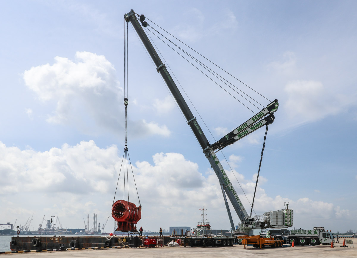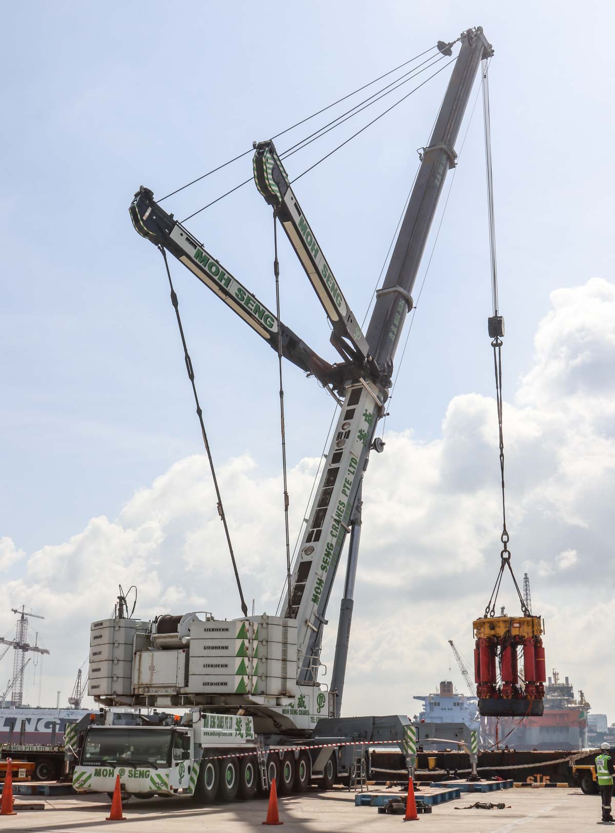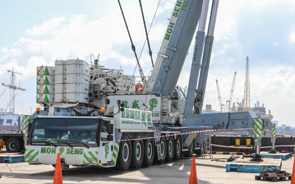 Here, the impressive Liebherr LTM 1750-9.1 of Moh Seng from Singapore (SG) was deployed on behalf of Bok Seng to lift two heavy components from a pontoon and load them onto transport combinations.