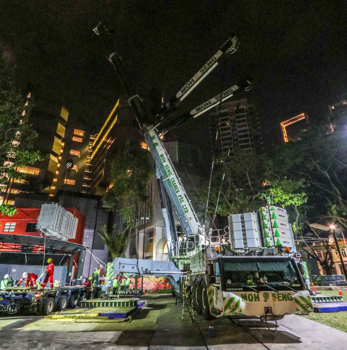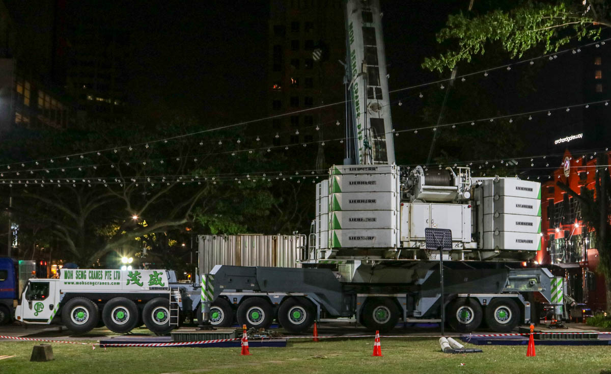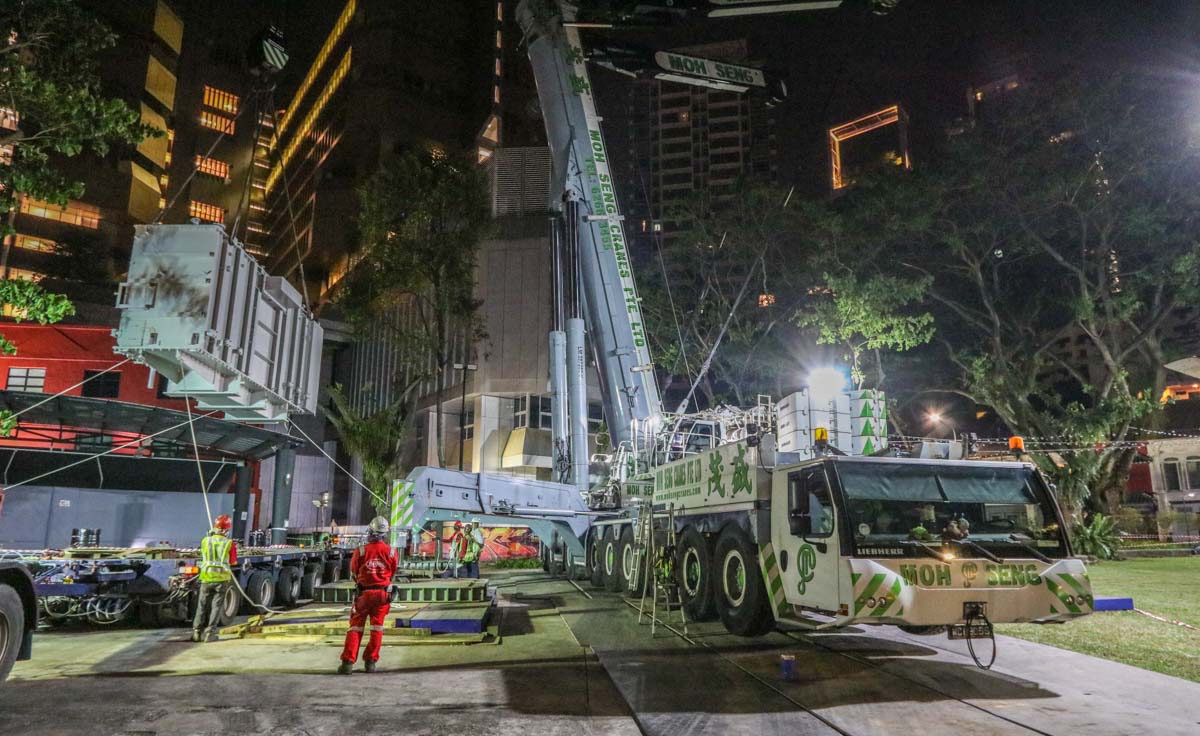 Here, the fine Liebherr LTM 1750-9.1 of Moh Seng from Singapore (SG) was deployed to lift two heavy transformers. This operation took place in the city center near the well-known Orchard Road.