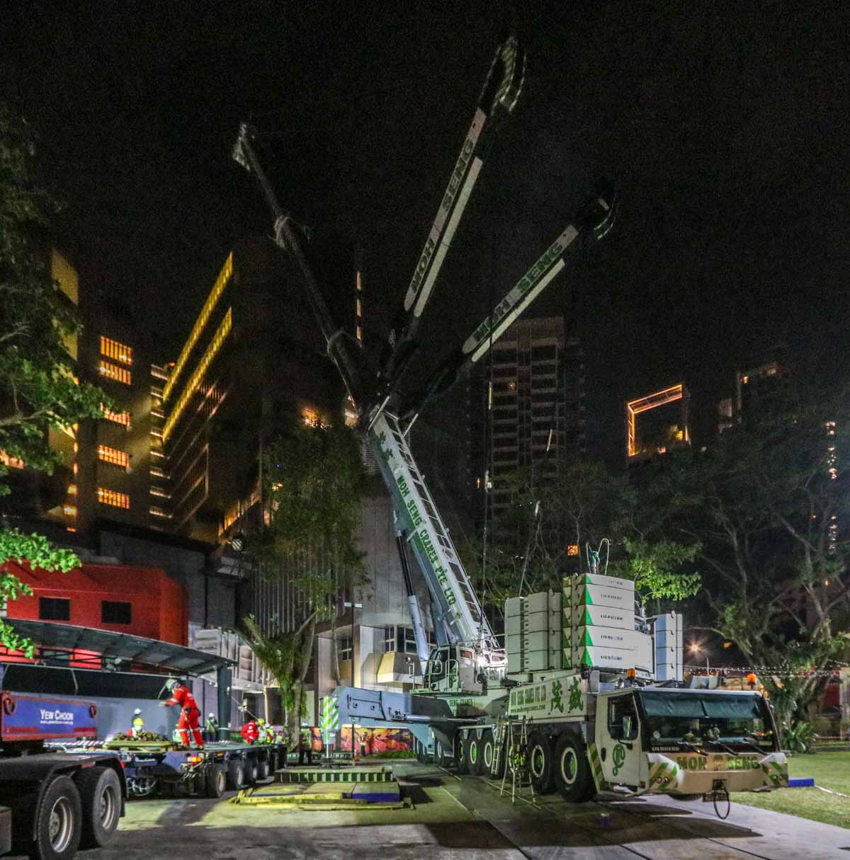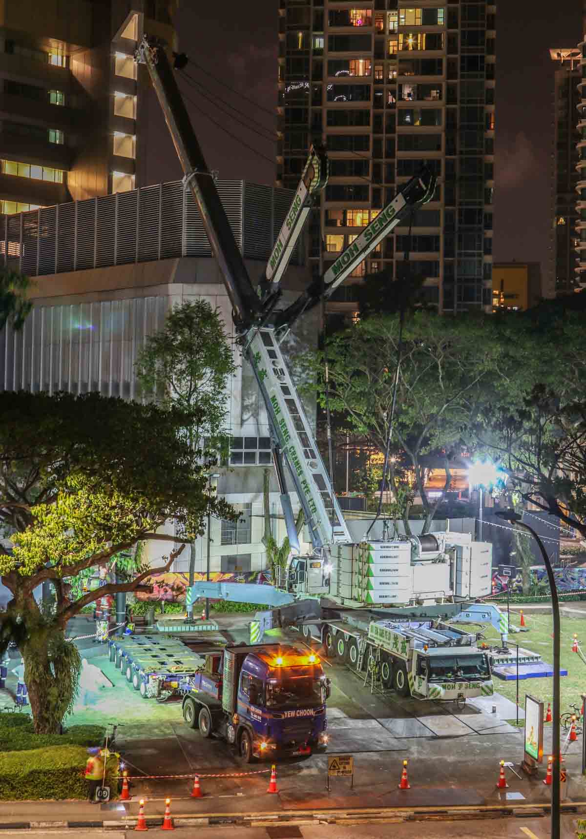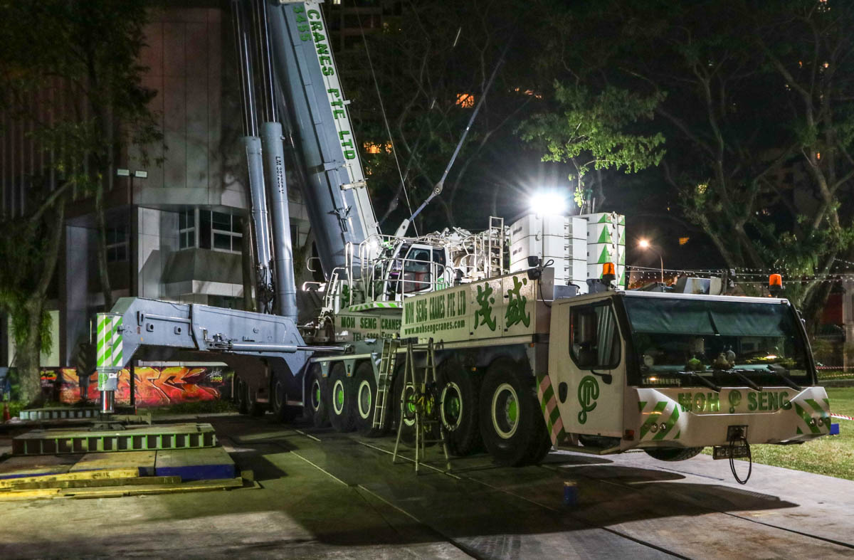 Here, the fine Liebherr LTM 1750-9.1 of Moh Seng from Singapore (SG) was deployed to lift two heavy transformers. This operation took place in the city center near the well-known Orchard Road.
