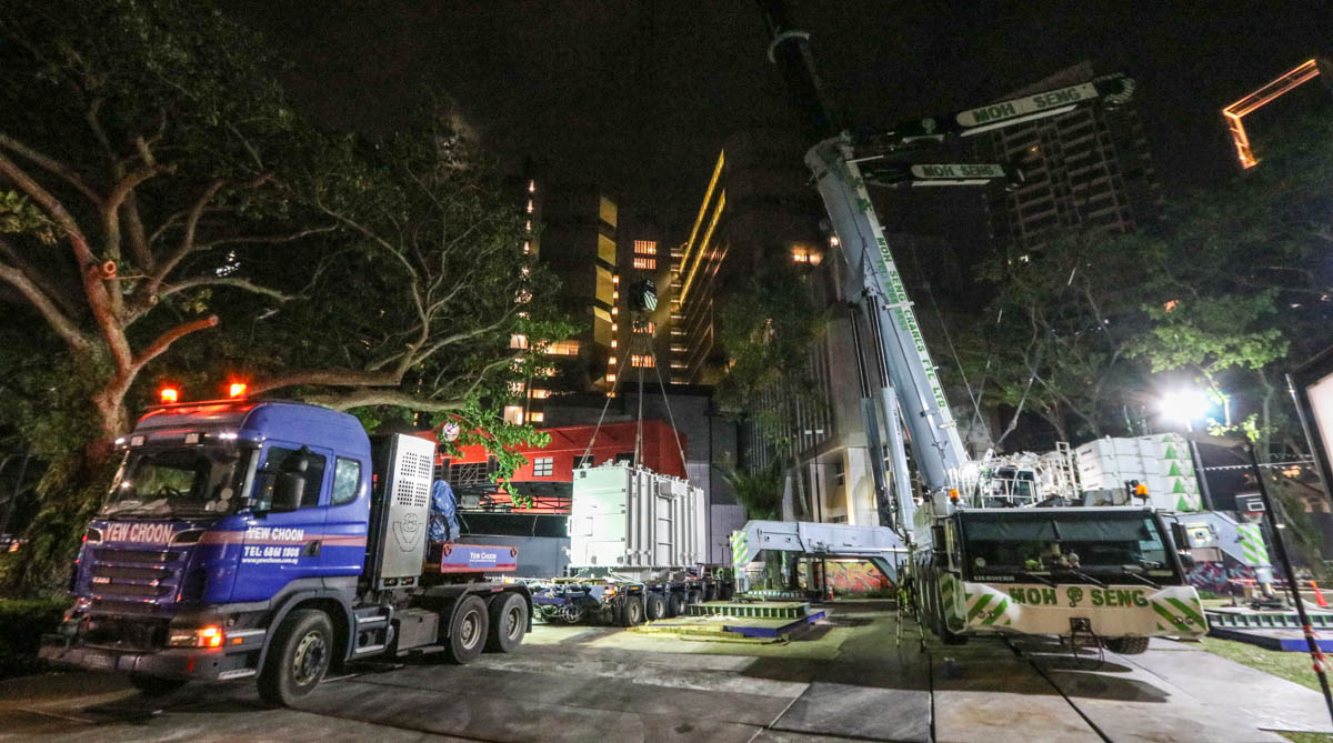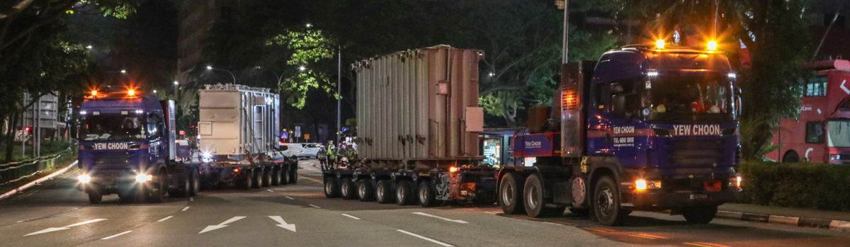 The old one out – and the new one in. The other Scania R 620 of Yew Choon delivers the new transformer using the same type of combination.