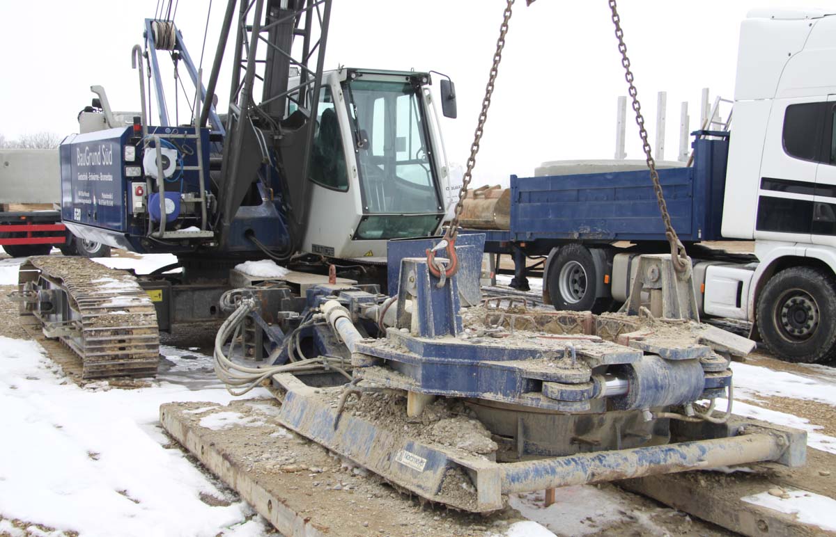 The casing is clamped in the oscillator and is then slewed for- and backwards in approx. 30 degree strokes under simultaneous vertical load, drilled into the ground.