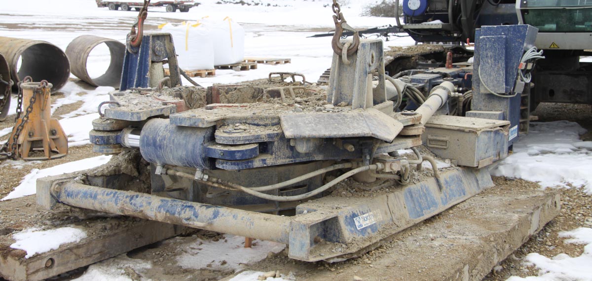 The casing is finally digged out with a grab the create a geothermal source in the hole. BauGrund Süd is using this machine to drill holes from 622 till 1080 mm diameter.