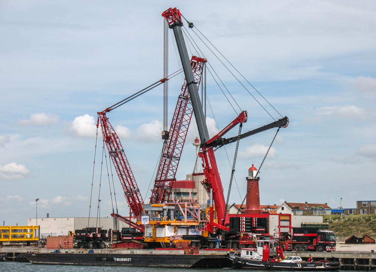 Het materieel om deze skid te hijsen zijn de Liebherr LTM 11200-9.1 (links) en een Liebherr LR 1350/1 (links). Het hijsen is hier al begonnen.