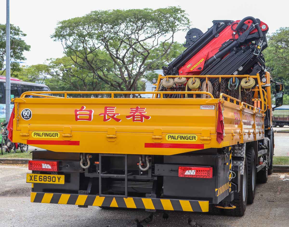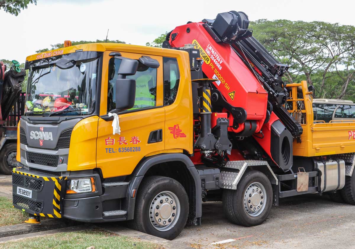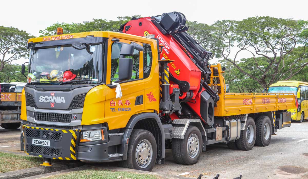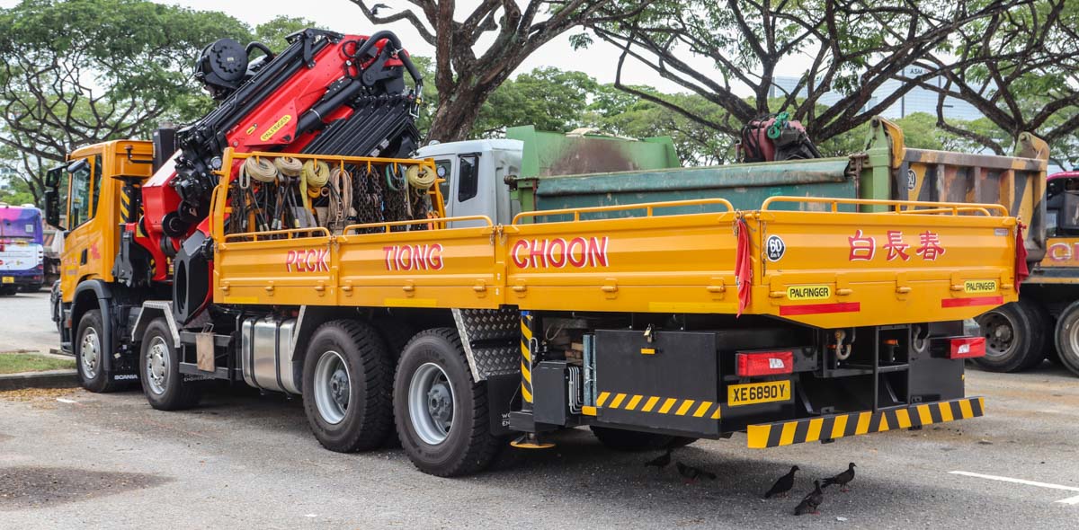 Deze fraaie Scania P 450 is van Peck Tiong Choon uit Singapore (SG). Het is een vier-assige bakwagen die met een zware autolaadkraan uitgevoerd is. Het voertuig stond hier tijdens een weekend op een parkeerplaats voor zware voertuigen geparkeerd. Het bouwjaar van het voertuig is 2021.