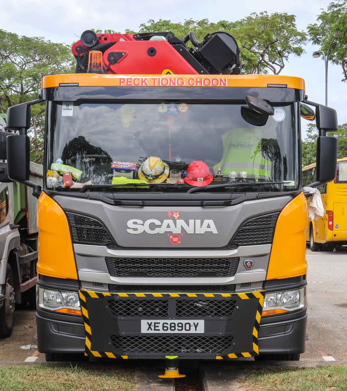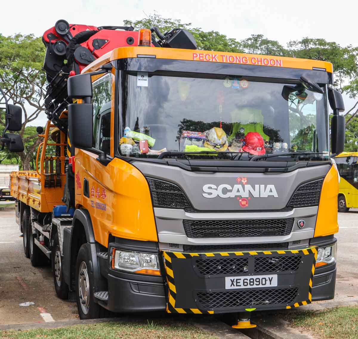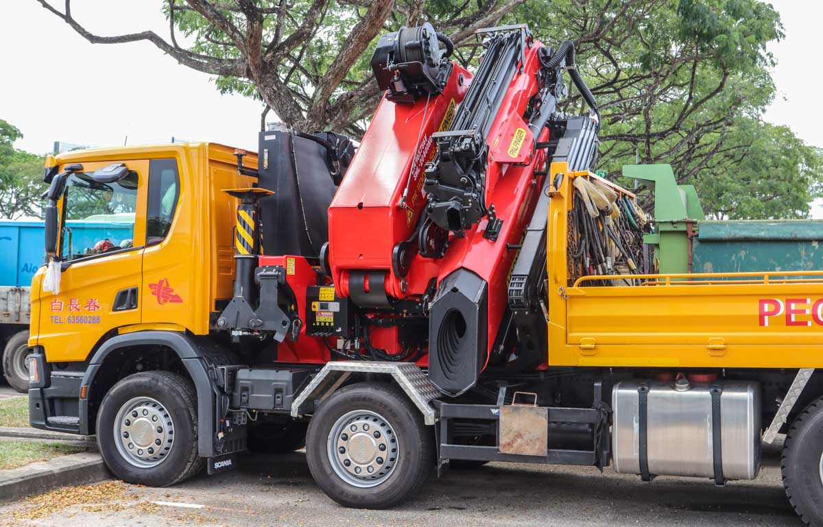 Deze fraaie Scania P 450 is van Peck Tiong Choon uit Singapore (SG). Het is een vier-assige bakwagen die met een zware autolaadkraan uitgevoerd is. Het voertuig stond hier tijdens een weekend op een parkeerplaats voor zware voertuigen geparkeerd. Het bouwjaar van het voertuig is 2021.