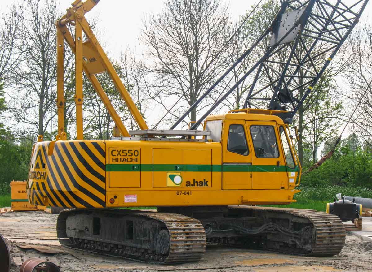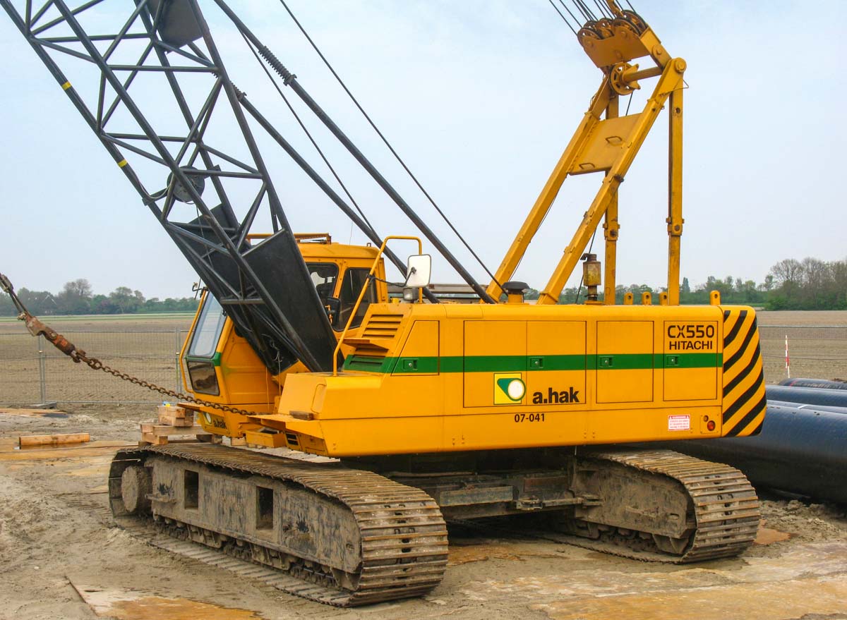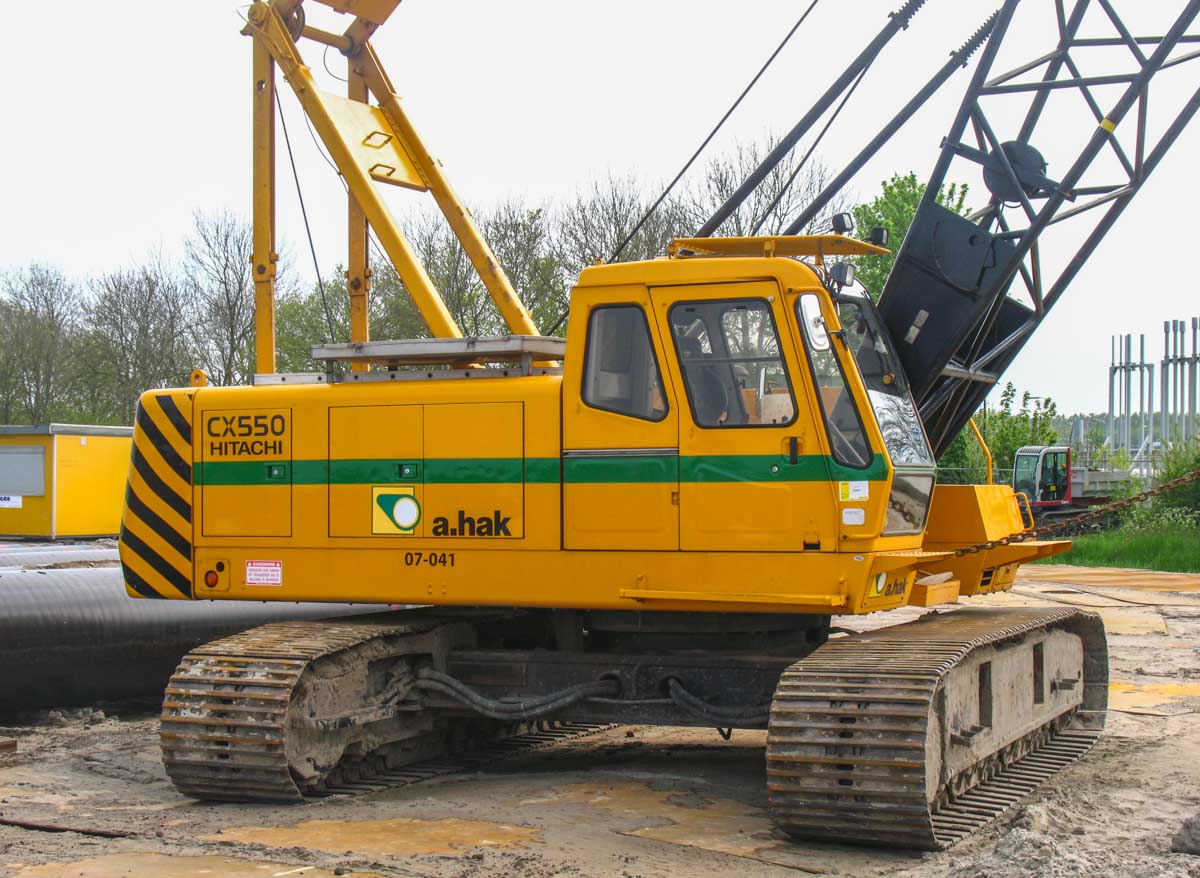 Dieser schöne Hitachi CX550 ist von A.Hak aus Tricht (NL) und wurde bei einem Einsatz in Opperdoes (NL) verwendet. Es handelt sich um einen 55-Tonnen-Raupenkran.