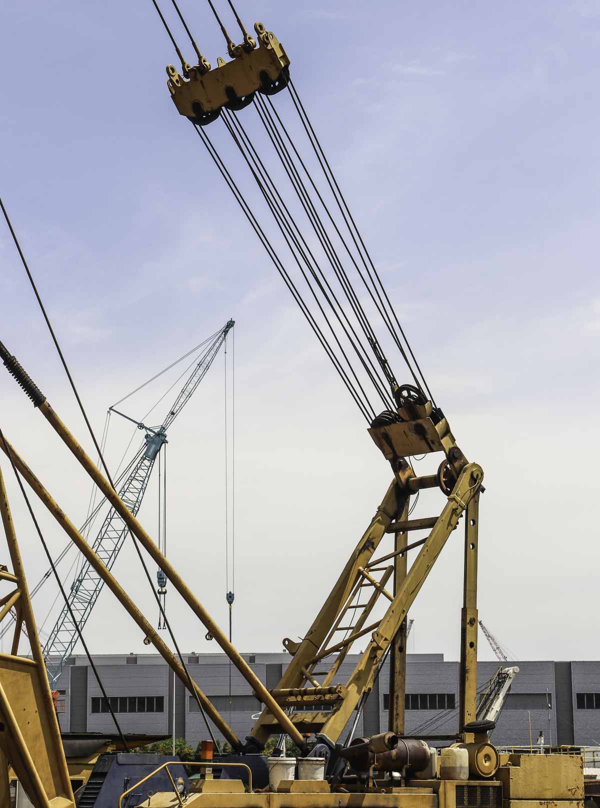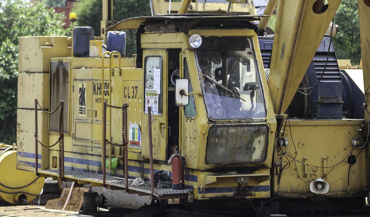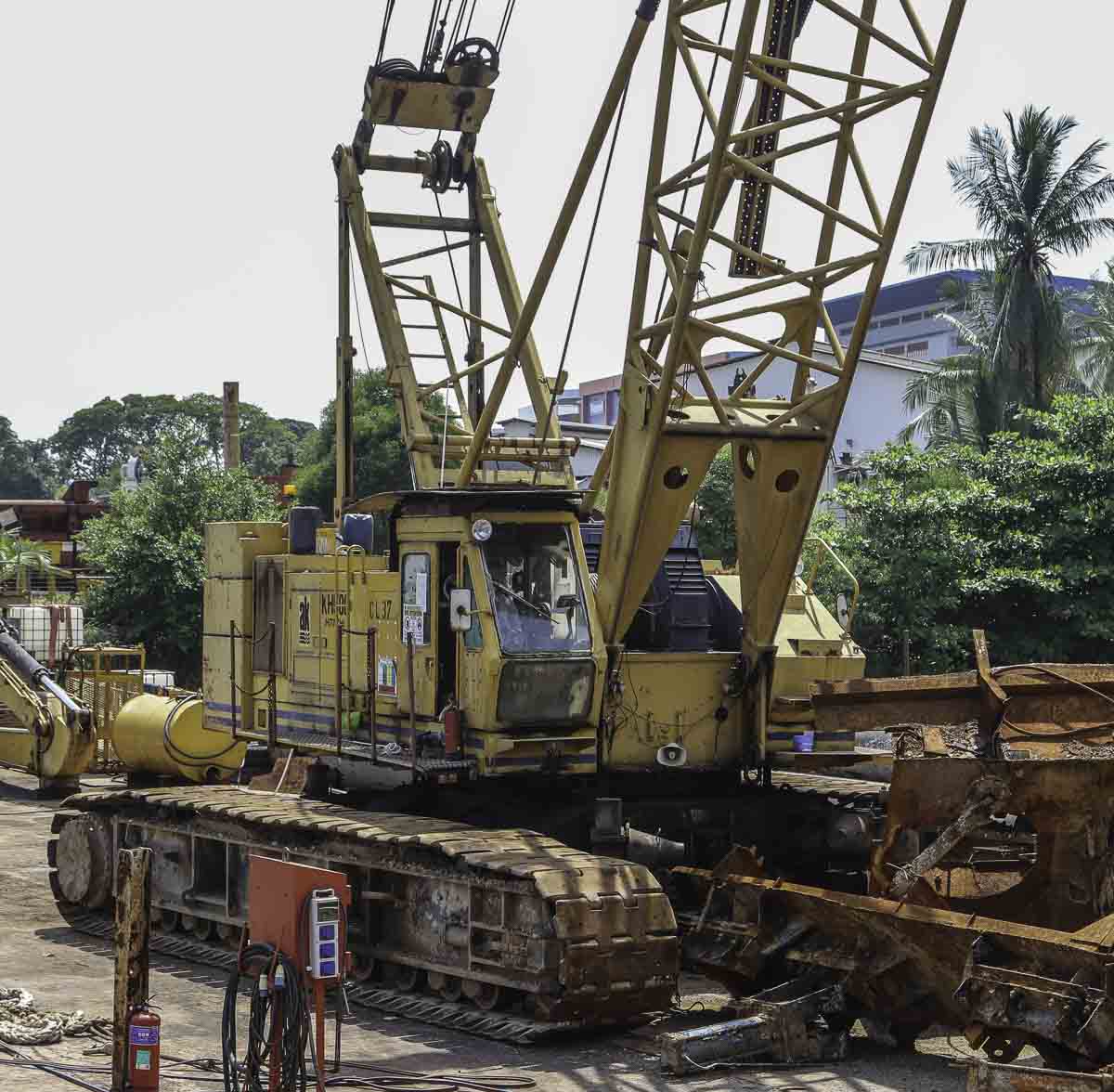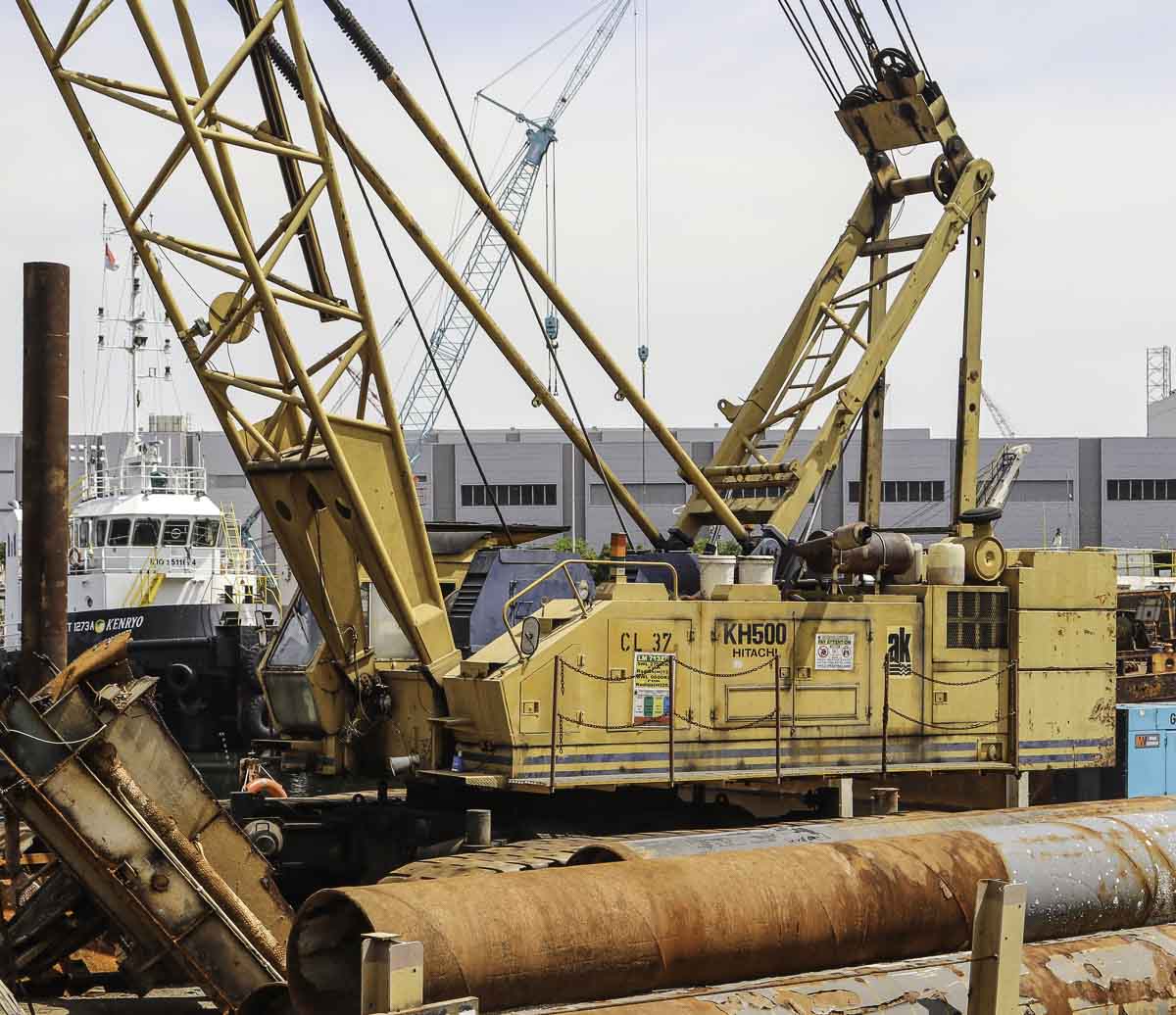 Dieser schöne Hitachi KH500-3 gehört zu Antara Koh aus Singapur (SG) und wird von einem Ponton aus eingesetzt. Es handelt sich um einen 100-Tonnen-Raupenkran.